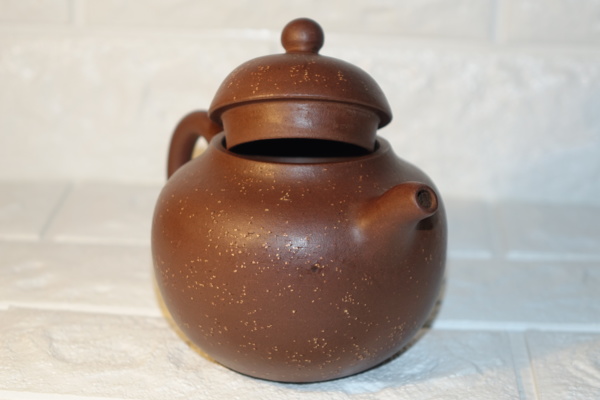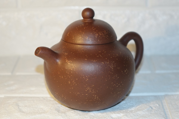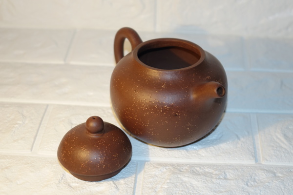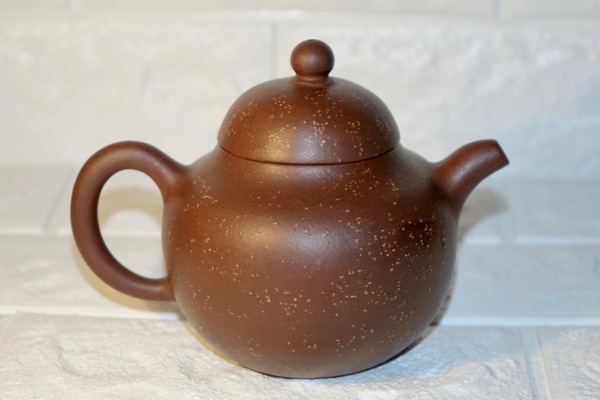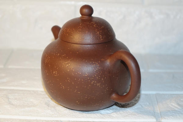本壺造型簡潔,紫砂質感溫潤細膩。滿天星色澤深黝含光,此壺材質為紫泥鋪砂,壺色赭紫,砂粒大而金黃,俗稱「黃金桂花砂」,古色古香。壺斜口,頸部略彎曲,橢圓形腹,無圈足,式樣仿造蓮子的匏壺。整器似攲不攲,曲線圓轉流暢,顯示出一種活潑柔順的美感,可謂柔中寓剛,圓中有變,厚而不重,穩而不笨,比例諧調,轉折圓潤。有骨有肉,骨肉勻稱,於變化之中求穩重。。取蓮子之形,巧意構思,壺身飽滿卻有清逸之感,線條柔和而有強勁力道,引而不發,持而不盈。