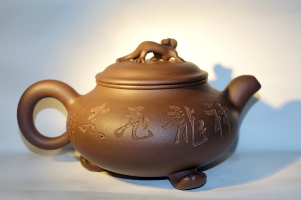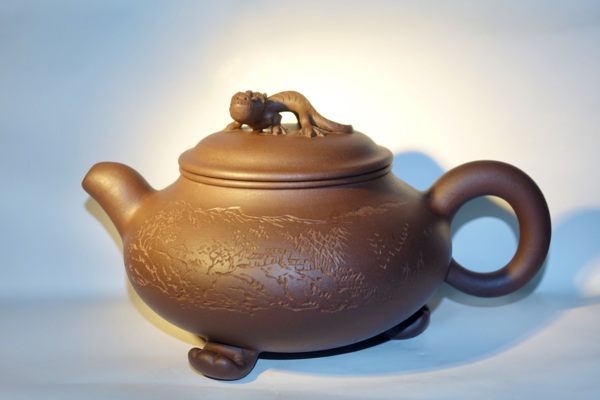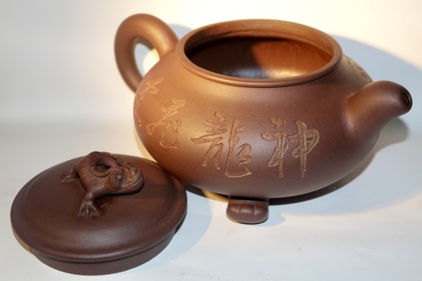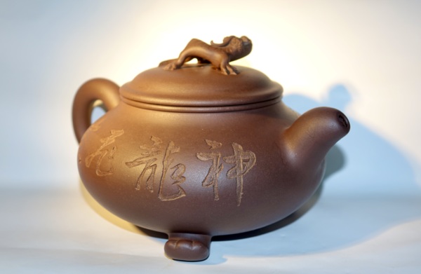 此壶扁圆形,以青铜鼎和龙为题材,壶体下设以龙爪形三足,微微凸起的壶盖上俯卧一昂首夔龙,神韻靈動,栩栩如生。特別是正面的龍紋,尤如猛然衝破雲層,騰空而出,極俱生氣。
