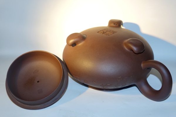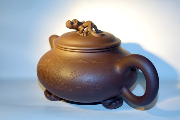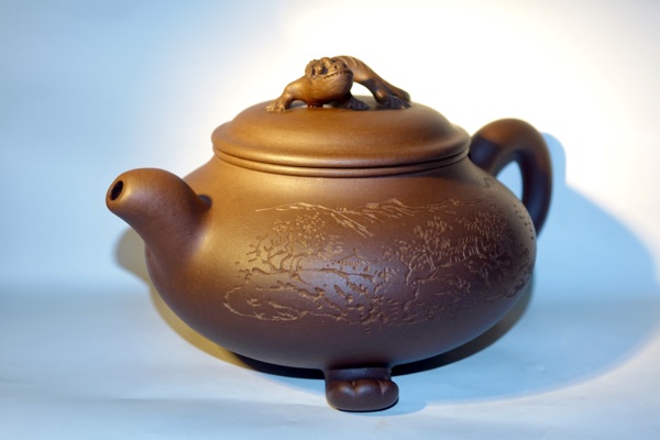 作者| 范洪泉:「范洪泉,男,1941年生于宜兴,2005年研高,江苏省工艺美术大师、江苏省陶瓷艺术大师。1956年进入紫砂工艺厂,师从吴云根、朱可心老艺人,为“可心花货”嫡传弟子,跟随朱可心二十余年,善制花货,开创巨壶制作之先河,堪称现代紫砂花货艺术的杰出代表。」 裝飾| 毛國強 容量:1300cc 泥料:紫泥 此壺泥料為老紫砂一廠的特級拼紫,呈色古雅 稍加泡養即潔潤通透,質地細而不膩,像上好的壽山芙蓉石。 觸感應手舒服,也讓毛國強大師的刀鋒得以隨心所欲 大刀闊斧,力透胎壁,與雄渾的壺體相得益彰。 |