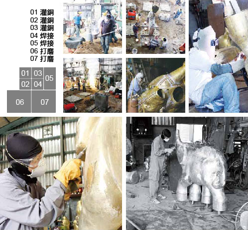 這組作品因為尺寸較大,銅廠分了三次才把所有鑄件完成,撬開冷卻的砂模後,金黃色的新銅溫潤的閃爍著。一件件銅殼裝上卡車運往專門組裝焊接的另一廠區,而我也隨即穿起工作服加入組裝修飾的行列。