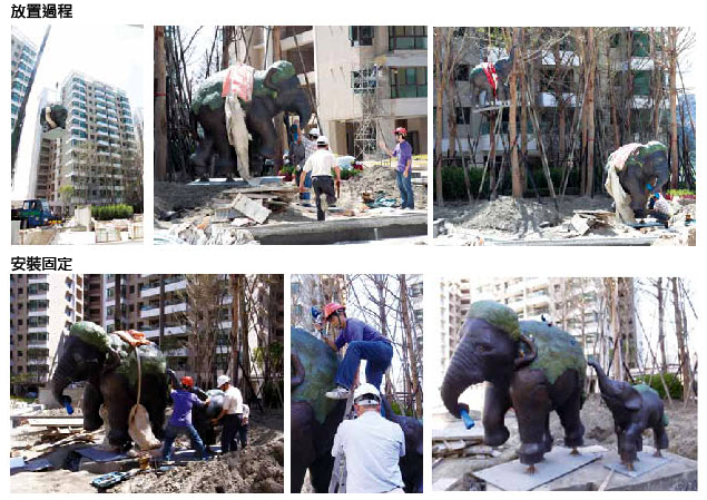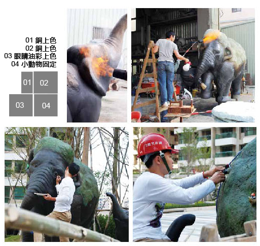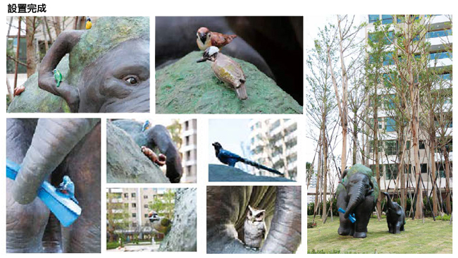 另外在森林大象身上所安裝的小動物也經過再次的思考後,決定以臺灣的鳥類與動物來製作成等比例的小銅雕,希望日後作品能在與住戶的互動中,能讓住在微笑莊園裡的孩子們藉由這件作品引發對周遭環境的觀察與興趣,讓雕塑不只美化建築,還能真正的與群眾互動,增添共同的回憶。
