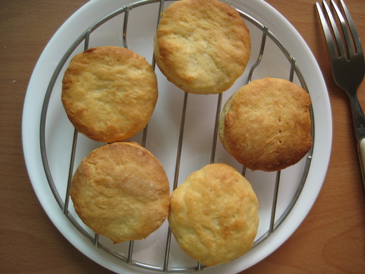 1.麵粉過篩,置於大盆 2.奶油切成小塊,跟麵粉拌勻 (好難描述,就是小塊的各自跟麵粉搓成小團,但不是讓奶油融掉不見) 3.慢慢加入優酪乳,拌勻成麵糰狀 4.壓平或桿片,用玻璃杯充當模子,壓出一個又一個圓 5.靜置5分鐘左右,進烤箱!! (真的是非常懶散的樣子,完全沒有細節的作法XD) 1. 有人說不能讓奶油融化,不然成品會沒有層次的口感,所以奶油要冰硬再用 2. 不想沾手,所以用刀子把奶油切成碎丁後,逐次逐次放進麵粉裡, 並搖晃盆子讓他們都裹上一層麵粉,才不會又粘在一起,白費了我切半天…… 3. 也是因為不想沾手,所以不用手捏,而是用飯匙一邊壓一邊輕拌 到最後就變成碎碎的一顆顆黃色的小粉糰,覺得應該好了,就加了優酪乳 (想做的人還是多多參考網路上的各家心得吧,自己也覺得我的太不可靠了) 4. 這次的優酪乳不小心加太多了點,後來還補了一些中粉進去 不一下子就拌成了麵糰,又可以拿出來不沾手的狀態 5. 麵糰不小心壓太平了(好傷心) 烤出來的比斯吉就好像哈比人一樣,長不高 如果要很漂亮的長高的話,應該要大約一公分以上的厚度吧…我猜 6. 成品很香喔,不過略有一點點的油,下次油放少一點吧(有人放豬油耶) 因為要再抹醬,所以糖放很少,這樣單吃其實剛好,可以配略甜的茶或咖啡 7. 烤的時間大概啊… 我把小烤箱轉了足足一輛 然後去洗了碗預熱(大約2分鐘) 才把東西放進去 因為壓很薄,所以約10分鐘後顏色就蠻漂亮的,遮層鋁箔再烤幾分鐘即取出 8. 上一次看別人的網誌說比斯吉不用加酵母,但是手邊沒有那份食譜要的小蘇打 只好看另外有加酵母的那種食譜來做,不知道做起來會差在哪? 不過,雖然有加了酵母,但可能是份量不多、時間不多、沒揉到 所以其實好像沒有什麼影響(?) 9. 吃了一個,剩下的做明天早餐,也順便看看放隔夜會不會變很難吃…… :P