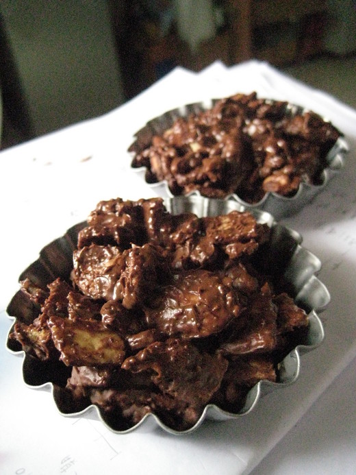 1. 發粉我用的是小蘇打, 1/4 小匙的1/3份量;砂糖放了 11g 甜度 OK 2. 這個份量的麵團幹薄後會超出小烤箱烤盤的大小,下次可以再減少總量約 30g 或是不要擀得那麼薄,也可以用手搓成小碎粒壓扁 ( 沒有擀麵棍的話這樣應該比較方便 )。喔對了,我沒有輪刀,所以用一般的水果刀而已~ 3. 第一次烤大約 3-5 分,第二次大約 3 分 ( 可能是我擀得很薄的關係 ) 4. 巧克力我有先切碎成小小塊再用。這次用的廠牌是甘百世,還不錯。但我下次想用七七出廠的大片巧克力試試。 5. 我是把它舀進小小的派模下去定型的,但我覺得分量有點太大塊了,一個人吃顯得太多。雖然按照比例算,我用 1/5 的量是分成 2 塊無誤,但我想下次分成 3 塊,讓它薄一點應該會更好。 (*圖二,已經冰過囉,黑黑的,如果有撒杏仁片應該會比較漂亮) (*圖三,剖面圖,看起來不錯吧^^) |