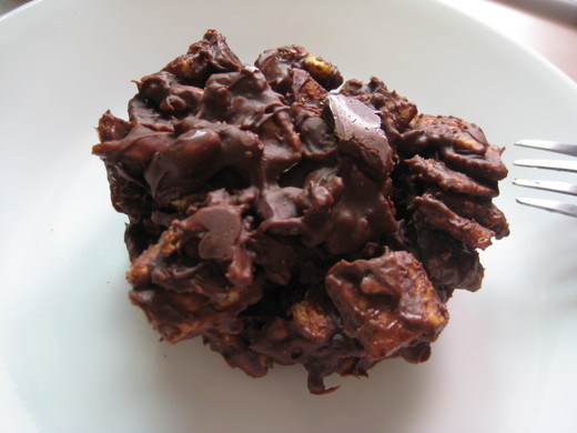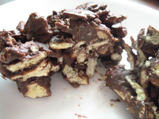 1. 材料 A a + b + c 攪打拌勻,再分次加入 A d 2. 篩入 A e + f ,拌勻,用手揉成糰 3. 將 B 撒在烤盤布上,麵糰直接在上面擀成烤盤布大小的薄片,用輪刀切成小方片或菱形片 4. 烤箱預熱至 180 度,烤約 10 分鐘上色即可取出,鏟起脆餅,輕敲使之碎裂 5. 再放回烤箱烤約 5 分鐘,至金黃香脆 6. 把巧克力放在盆子裡,烤好的脆餅趁熱倒入讓巧克力融化,攪拌均勻 7. 平圴份量舀到烤盤布上,撒杏仁,冷藏至完全硬化即可食用