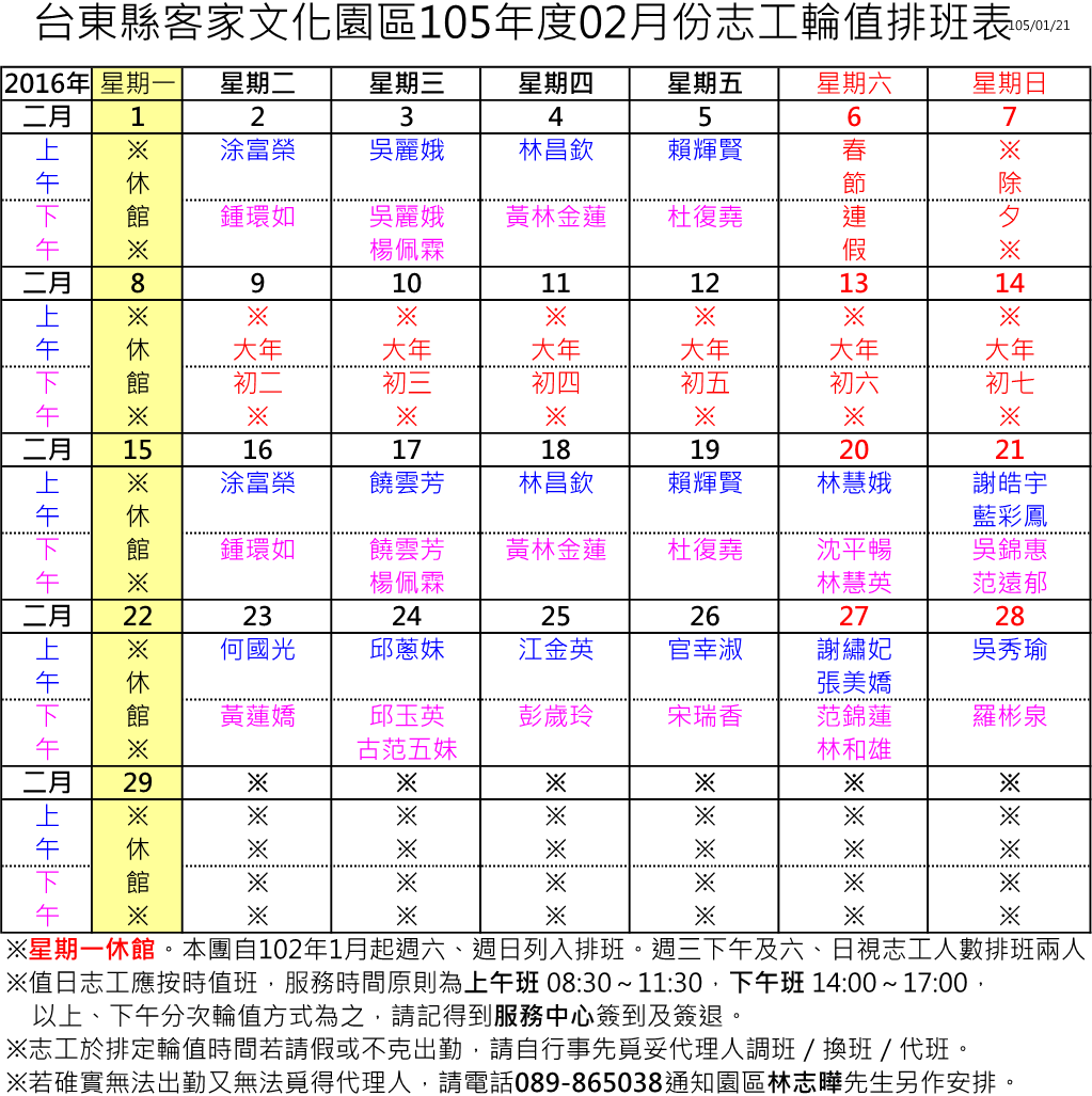 105年02月份志工輪值排班表(※2/6~2/14春節連假,爰例不排班!)