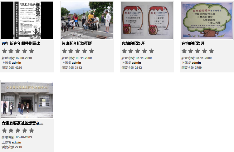 ※上課地點:台東縣客家社區影音紀錄中心 ◎注意事項: ●相關檔案下載:2011東台灣影音紀錄人才進階培訓簡章報名表 ---------------------------------------------------------------------------------------------------- 99年度新春年假特別展出 -99.2.8 99年新春年假特別展出~台東懷舊照片及紀錄片 ~年假何處去,這裡有人文知性之旅 ------------------------------------------------------------------------------------------------- 2009東台灣影音人才進階培訓 【2009東台灣影音紀錄人才進階培訓錄取通知】2009.06.21 ※恭賀※歡迎您加入東台灣懷舊夢工廠的行列,讓我們一起用影像寫歷史! 1.請於07月04日0800時報到,因有邀請長官主持始業式,務請按時 參加。 錄取名單: --------------------------------------------------------------------------- 開站啟用公告!-98.05.06 台東縣客家社區影音紀錄中心影音網正式啟用... 一群熱愛後山鄉土的人士所組成的團隊,利用攝影機鏡頭紀錄當地人文、歷史、地理、自然、生態、風土民情、古蹟建物....等,透過線上影音來分享在地文化。