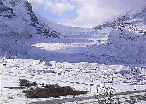 當時雖是9月,卻飄起來了細雪。到達著名的哥倫比亞大冰原(Columbia Icefields)時,我還不知道它就是大冰原,只記得入口一節一節地樹立年份標誌,原來是紀錄這些年冰原一直融化後退的標記。我們迎著風雨艱難地行走,越到冰原深處越難行(因為球鞋會打滑),記得只有我和幾個男同學堅持走到更「上面」,四周一片白茫茫,寒風刺骨,景色是絕對的壯麗無比。