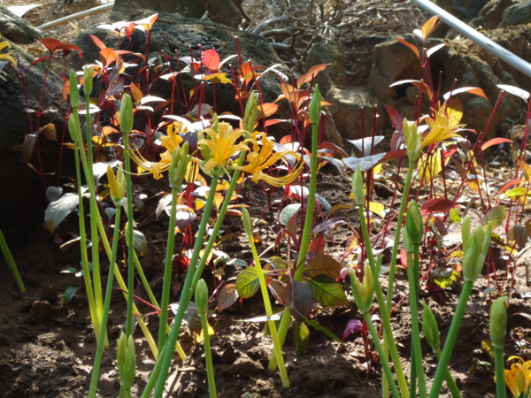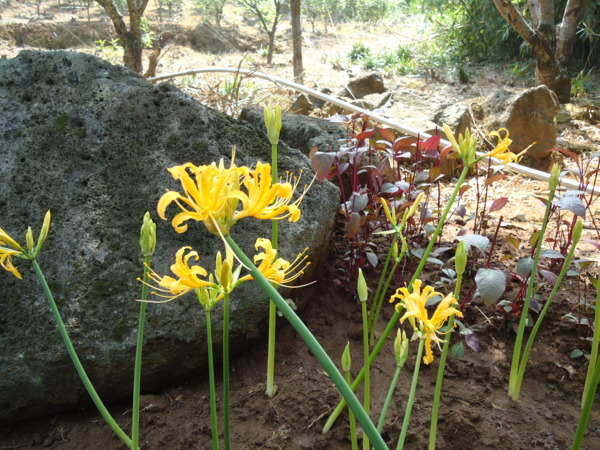 四部車在 楓樹湖金花石蒜牌樓旁空地會合。 幸福滿足地出發囉。 才剛到大家就分享到美雲的芭蕉和苔伊的芝麻糖。 楓樹湖 — 好美的名字,位於新北市淡水區水源里,不過並不是真的有一個湖,「湖」指的是位於山谷之間的凹地,加上早期本地有許多楓樹,故名「楓樹湖」。 很有趣的名字,「跤頭趺」就是台語「膝蓋」之意。傳聞當初先人來此開墾時,見此地前後有兩座圓凸的山頭,狀似人的膝蓋,遂用台語 「ㄎㄚ ㄉㄚˇ ㄨ」為此步道命名。跤頭趺崙步道自淡水大溪 7 號至楓樹湖 23 號民宅,約僅 400 公尺,古樸的石板階梯,蓊鬱青翠的綠竹,是一條風景優美而精緻的超迷你步道。 九月底來,可能還是早了些,看不到楓紅。 這就是今天的主角,金花石蒜,美麗吧。 愛花又愛照相的二位生活藝術家。 遠遠看以為這裡也有座龍山寺,走近才知是海龍山寺。