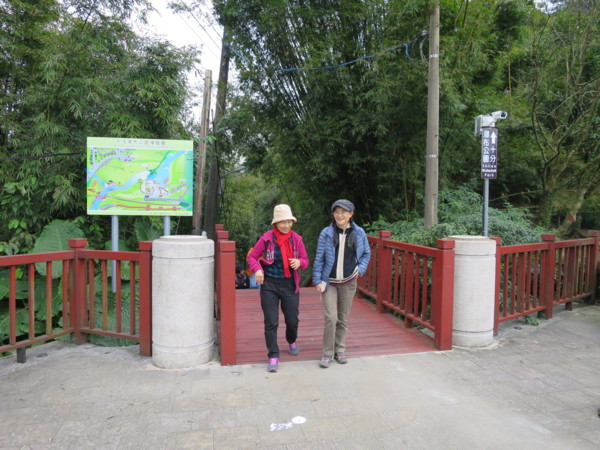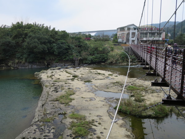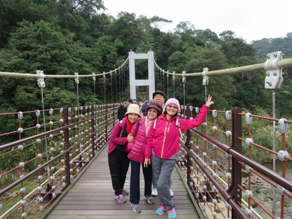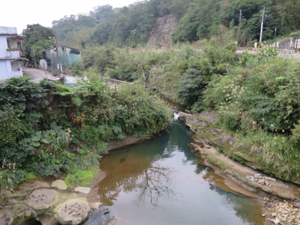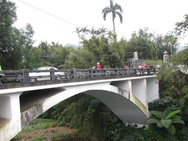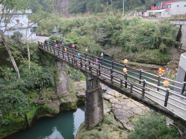 欄杆遮去了不少美景 此門是原來收取過路費的地方,現在已封閉。不過也因此無法沿著軌道去欣賞另一美景「眼鏡洞」 返回遊客中心,四廣潭吊橋前拍團照 吊橋的盡頭因私人土地,已封閉。 吊橋上回拍遊客中心 吊橋下的四廣潭,有很多壺穴地形 (二)嶺腳‧被遺忘的小村落 嶺腳距離平溪車站約一公里,是平溪線上一顆被遺忘的珍珠,與世無爭的沉睡在基隆河畔。每逢假日,小火車載著滿滿的乘客,奔往菁桐、平溪和十分,但嶺腳的月台永遠是那麼冷清。嶺腳小村落也得以保存住它的純樸與優雅。 嶺腳有三寶:嶺腳瀑布、嶺腳古橋與蔡家小洋樓。我們今天此行就是探訪這三寶。 嶺腳古橋,古橋下是基隆河最窄處。古橋建於日治時代,但民國43年曾加以整修。古橋橋面的舊護欄原已掉落不整,現已在內側加裝新護欄,行人可以通行。 基隆河流經平溪,溪床平整(平溪是以得名),到古橋後溪床開始變化下切,除有豐富的壺穴地形外,還有許多淵潭,淵潭間形成大小溪瀑。當地文史工作者稱此種溪谷為「三疊潭」,此圖片為第一疊。
