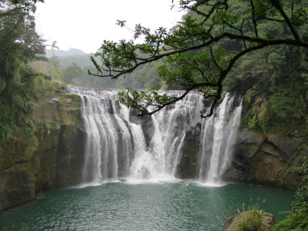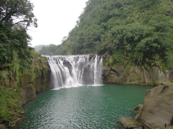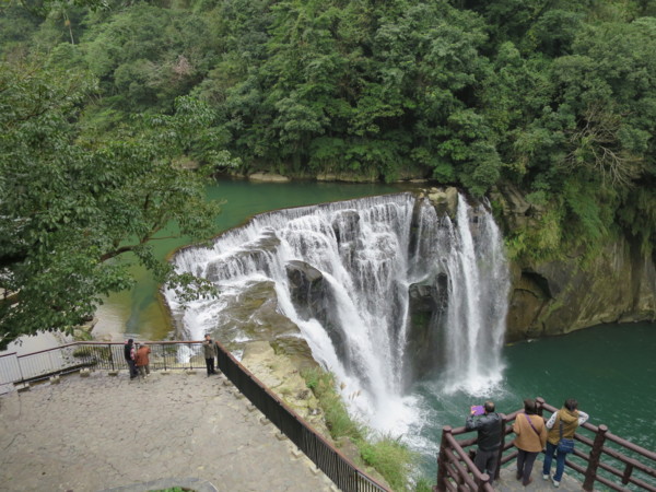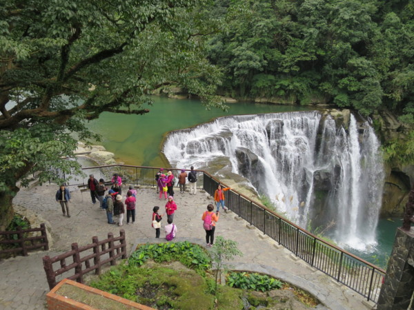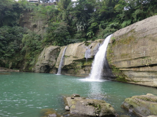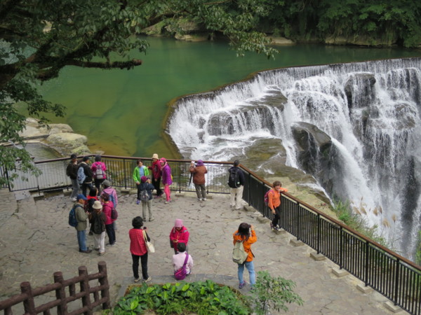 三三兩兩擁抱美景 回望觀景台II 觀景台III可看到瀑布上方的基隆河 十分瀑布落差約20公尺,寬度約40公尺,外層岩頃向和水流方向相反,屬「逆斜層瀑布」,此情況與北美的尼加拉瀑布相似,使其贏得「台灣尼加拉瀑布」的美譽。瀑布下方水潭極深,水氣長年瀰漫不散,一經陽光折射,一道清麗的彩虹跨其上,故又有「彩虹淵」的美名。