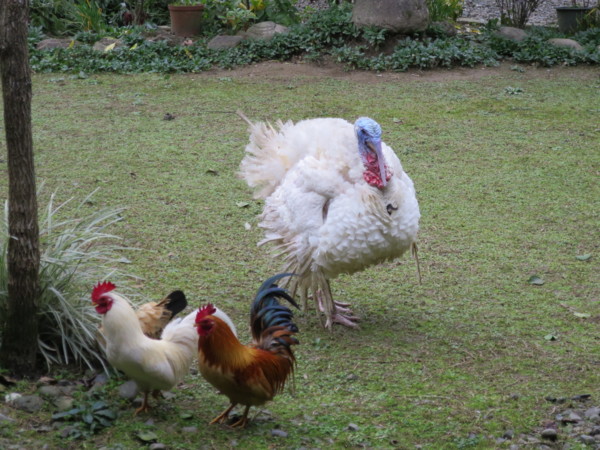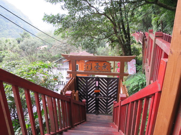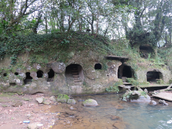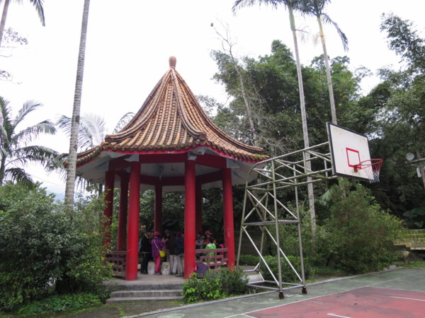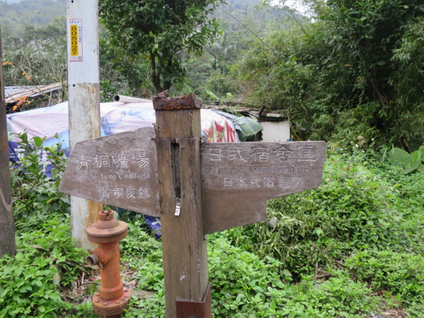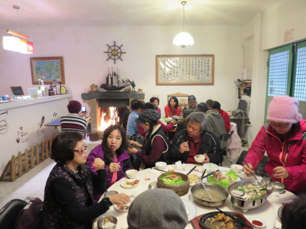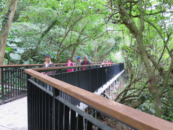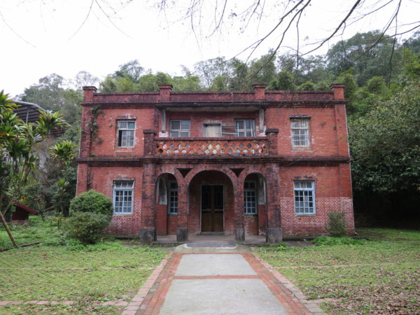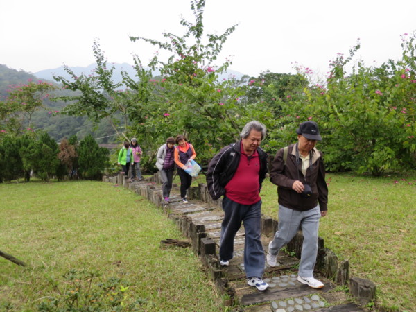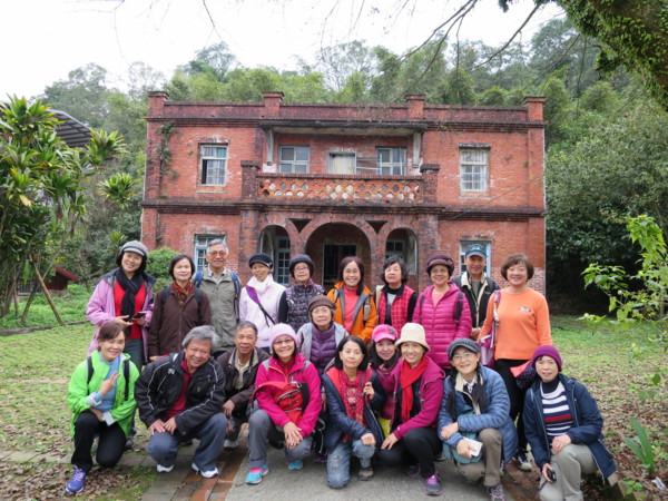 約3分鐘後就可看到嶺腳瀑布入口。嶺腳石窟大瀑布原經營私人遊樂區,現已荒廢,但仍留一小洞讓人進入。有點陰森,但勇敢地走進去吧! 進入後沿著石階步道往下走(回程時攝) 不到五分鐘就可到達嶺腳瀑布潭邊。多日無雨,嶺腳瀑布瘦身許多。 潭邊小山丘有許多洞窟,不知是何作用。嶺腳瀑布因此又稱「洞窟瀑布」 潭邊腹地不大,適合小團體拍照。 參觀完嶺腳瀑布後,經過嶺腳車站,穿過嶺腳老街,前往蔡家小洋樓。途中有一小小公園與籃球場。 蔡家紅磚小洋樓就在公園前約50公尺地方。蔡家小洋樓是永昌煤礦的創業者蔡全先生於西元1939年建造。其子蔡石勇士第一屆資深國大代表。 目前此屋無人居住,但仍由蔡家後代維護與管理。 蔡家小洋樓對面的「銀樓」,屋頂牆壁全是銀色。 返回嶺腳車站,剛好遇到平溪線火車進站停靠,果然無人上下車。 (三)白石庭園與日本宿舍區 白石庭園餐廳我們曾造訪過一次,那時感覺園區很美麗,種有許多奇花異草,老闆人也很親切,會介紹各種稀奇的花草。所以這次仍選擇白石庭園當作此行的午餐所在。 但令人失望的是,園區沒令人期待的改變,老闆也變得較不熱情,最重要的是餐點變得又冷又難吃,下次應該不會來了。 離開前還是來個大團照 火雞與矮腳雞反而較吸晴 天氣有點涼,老闆點燃了壁爐