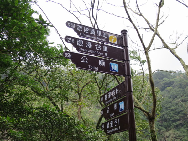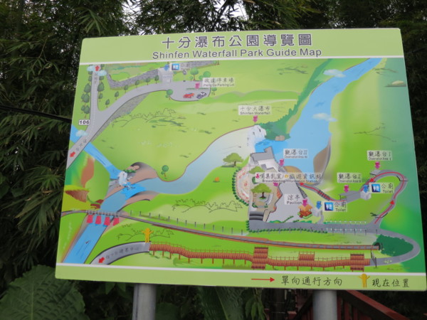 十分瀑布是全台最大的簾幕式瀑布,被稱為「台灣的尼加拉瓜瀑布」,以往民眾進入十分瀑布「公有領域」,20多年來要付出200--250元過路費,當時有一名檢察官假日前往被收錢後發現有異,細問之下才發現,原來十分瀑布外一小段路屬於私人土地,地主認為「此樹是我栽 此路是我開 要想過此路 留下買路財」。經多次反映後,新北市府因此徵收了部分土地,並建造了一條「綠廊步道」,在去年底重新開放遊客免費入園,將大自然景觀還諸於民。 十分瀑布遊客中心,內有簡報室定時放映影片,可多角度欣賞十分瀑布美景 遊客中心後有步道可欣賞四廣潭。四廣潭吊橋後是以往通往十分瀑布的必經道路,現已封閉。 想去十分瀑布,必須沿著遊客中心前的車道前行約七八分鐘,才會到達「綠廊步道」入口。此道路禁止車輛進入,路旁有一小段枕木步道。 「綠廊步道」入口,旁有詳細地圖。 咖啡色部分是木棧道,灰色部分是水泥或石板步道。從入口慢慢走,約十分鐘左右就可到達十分瀑布觀景台。 紅色的木棧道,走起來很安全,但感覺顏色太突兀了。 無憂門是私人的觀景平台,大門深鎖,可能只有假日才營業吧。 此段是水泥路面,黑色欄杆搭配原木色把手,看起來較柔和。 重要路標,一定要遵守方向,先下階梯往觀景台I和觀景台II 觀景台I,可看到整個簾幕式瀑布,但看不到瀑布下的深潭 此時觀光客還未到,可從容地拍照 觀景台II,除了簾幕式瀑布,還可看到瀑布下深綠色的潭水