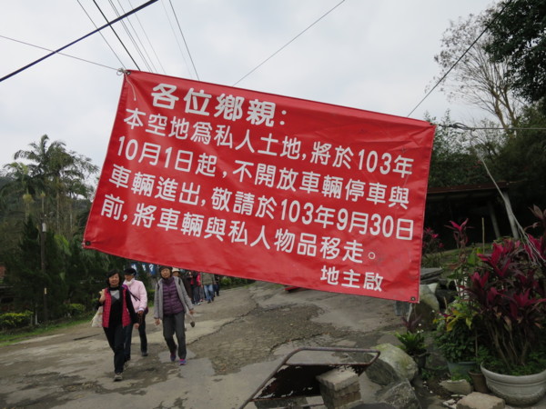 古橋旁新建的新橋 過橋後右邊活動中心旁的空地原本可停車,現已被禁止。自行開車者請在過橋前路邊較寬廣處停車。嶺腳瀑布就是從此紅布條進入,過活動中心後沿鐵道旁小路走。