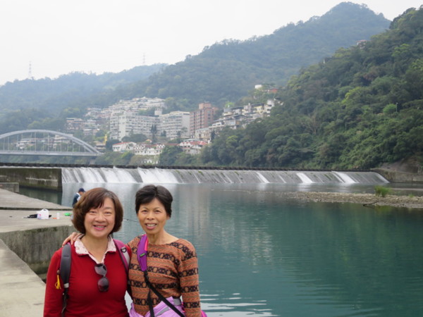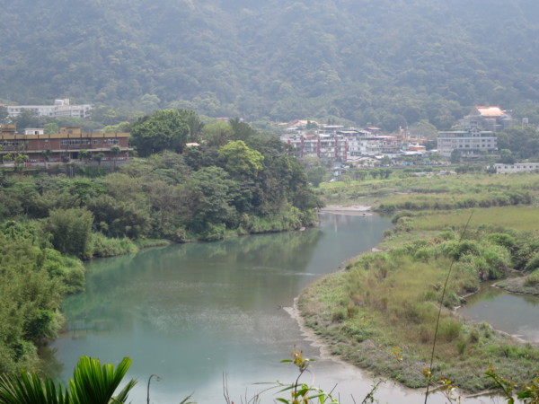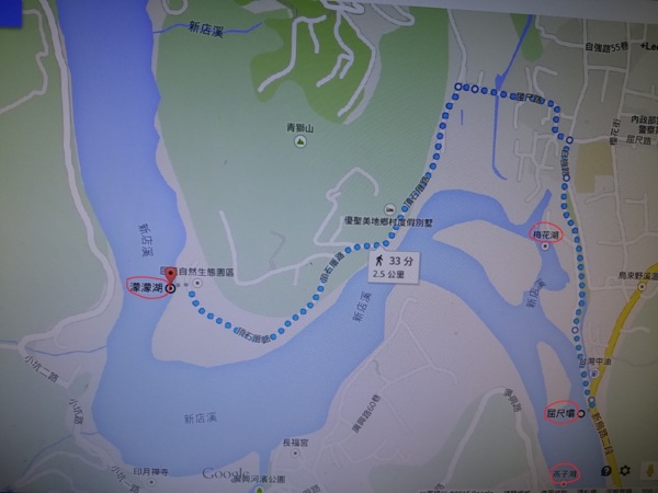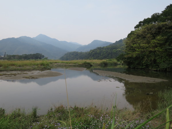 有人有自知之明,選擇跨越而過 有人偏不服輸,結果動彈不得 步道中途可下到岸邊平台,是觀賞屈尺堰全貌的好地點,可惜受大陸塵霾影響,視野不是很好 梅花湖因屬湖泊型溼地,所以成為一處天然的水鳥棲息生態地 回到引水道步道入口的觀景平台,可觀賞梅花湖全貌 (三)屈尺社區與濛濛湖 濛濛谷在1960年代已是大台北地區莘莘學子及情侶們鍾情的山水聖地。1979年直潭壩建成後,水面陡升,淹沒山谷,濛濛谷不再,取而代之的是「濛濛湖」。濛濛湖腹地寬廣,大花咸豐草、蟛蜞菊遍佈,水鳥棲集,景色宜人;雨齋則一片迷濛、清幽,如詩如畫。 走訪濛濛谷,從屈尺景觀公園沿著自強路直走,在屈尺派出所左轉屈尺路,屈尺路走到底再左轉頂石厝路,濛濛谷即在頂石頭路的盡頭 屈尺社區主要是分布在屈尺路兩側,位於新店溪水域中的轉彎處,形狀很像曲尺,所以才有「屈尺」之名。屈尺社區鄰近烏來,是少數幾個不是以信仰基督或天主教為主的社區,屈尺路上的「岐山巖」主祀清水祖師,是屈尺社區的信仰中心。 岐山巖清水祖師廟建於1923年。屈尺與廣興兩村比鄰而處兩地並同以「清水祖師」為主要信仰;據傳聞,昔日南勢溪時有洪災,當時有一巨大良木順南勢溪而下,後由屈尺民眾勾撈上岸並將該木一分為二,上端用以雕刻屈尺清水祖師廟中金身神像,而下端則用以雕刻廣興清水祖師廟中金身神像。 百年老樹「九丁榕」。九丁榕常被誤會成榕樹,因為它們同為桑科榕屬的植物
