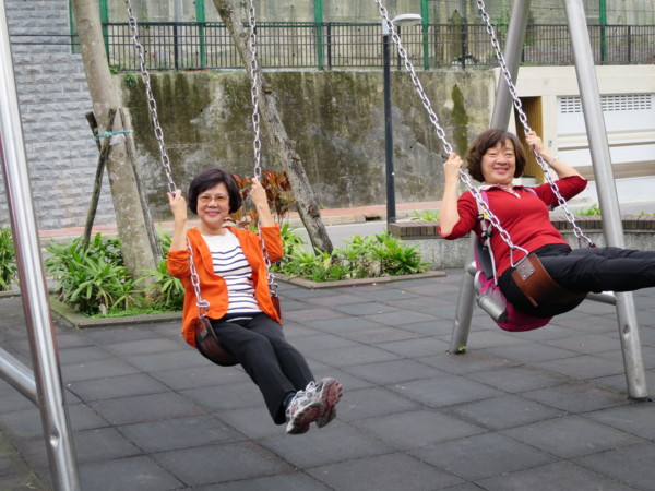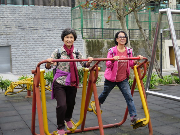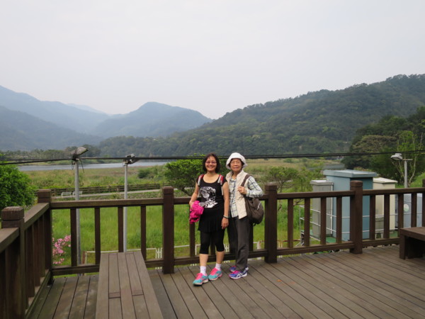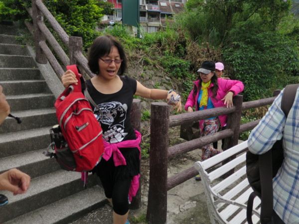 爬上岸頂,越過欄杆,就是梅花湖步道(上第二張為苔伊相片) 欄杆有一隙縫通道,剛好用來檢驗身材。仟幸輕騎過關。 有人雖然卡卡,但吸氣縮腹後還是勉強過關