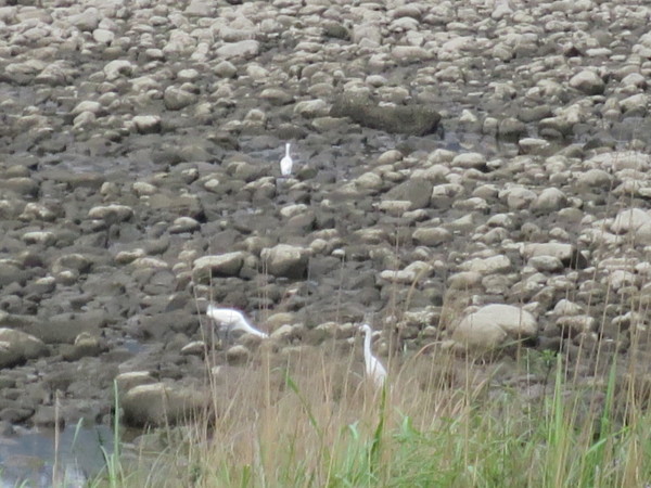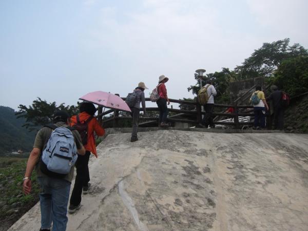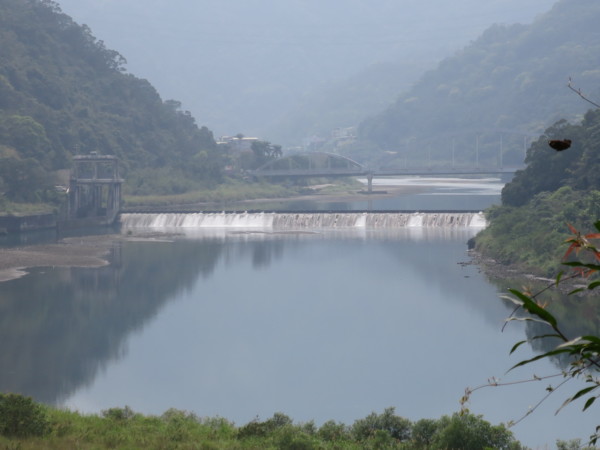阿伯身先士卒,搶先欣賞美景,其他人禁不起誘惑,也陸續而下。(苔伊相片) (二)屈尺堰與梅花湖 屈尺堰又稱屈尺壩,即日治時代的「粗坑堰堤」。是一小型攔水堰堤,屬混凝土重力壩,採自由溢流方式。引水圳道由屈尺堰右方引新店溪水,供應小粗坑發電廠發電用水。堤堰滿溢時的滔滔流水是大台北地區人們飲用水的生命泉源。壩堤左方設有魚梯,也是新店新上唯一設有魚梯的攔水壩。 南勢溪與北勢溪在下龜山橋匯流成新店溪,流經廣興遇屈尺堰被攔截後,自然形成一湖泊,常見群燕聚集,故名「燕子湖」。溪水越過屈尺堰,來個90度大轉彎,其形狀如一把彎曲的尺,這就是傳說中屈尺地名的由來。在轉彎處溪水匯集成一淺潭,名為「梅花湖」。因為位置較為隱密,且屬湖泊型溼地,所以成為一處天然的水鳥棲息生態地,是野餐、賞鳥及生態觀察的好景點。可惜湖畔紊亂,且無任何休憩設施,顯得有點荒涼。 屈尺堰上方為燕子湖,後方為廣興橋 這邊雖然禁止釣魚,但因魚量豐富,還是吸引許多釣客 堤岸風光的確不錯,沒後悔冒險下來