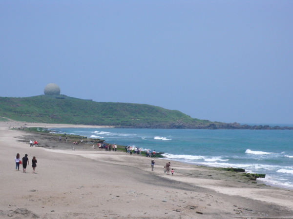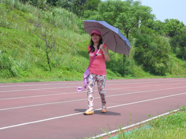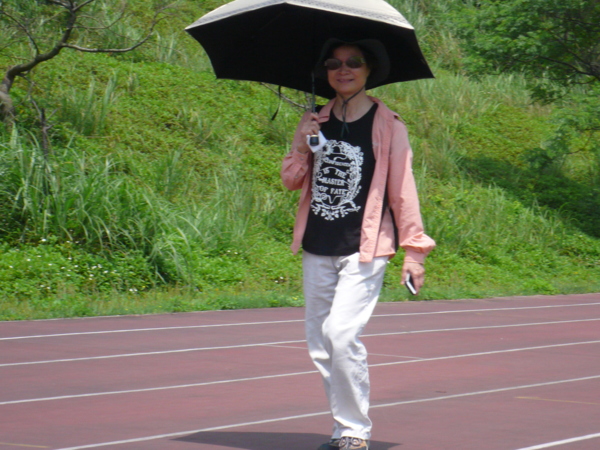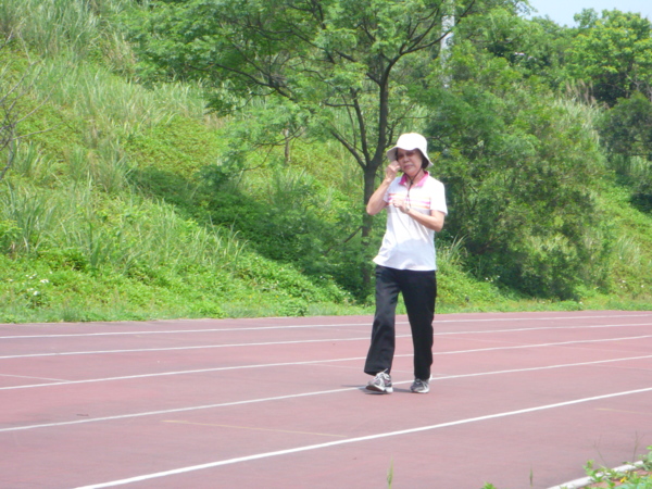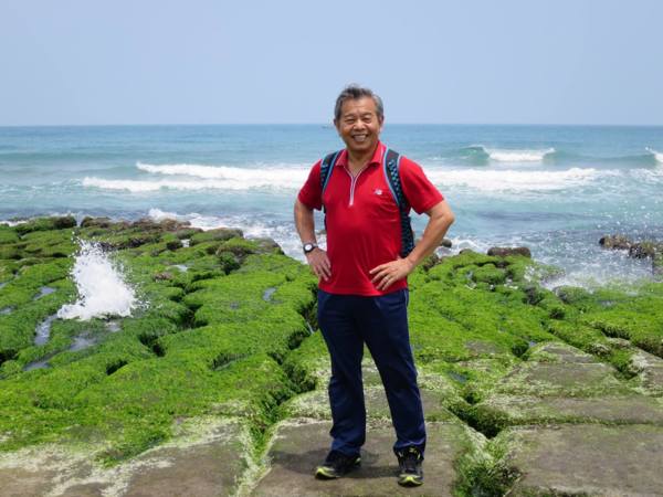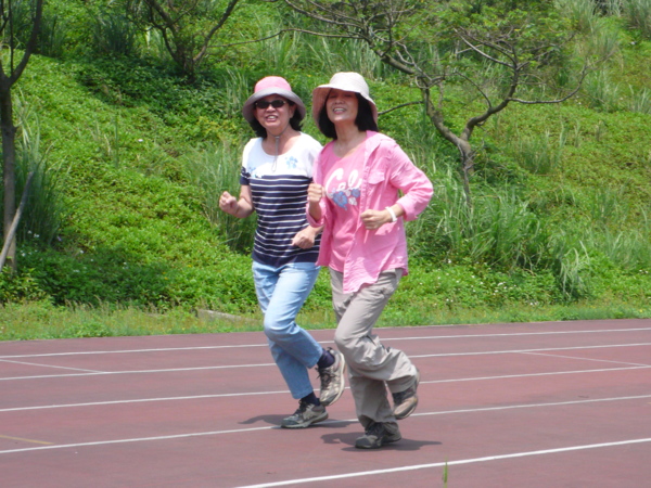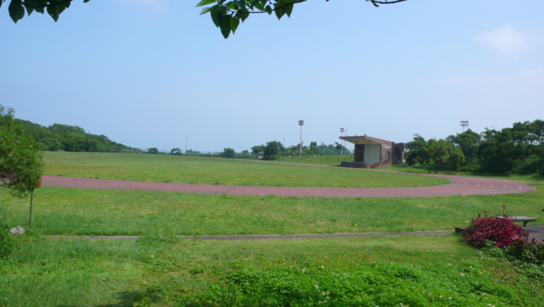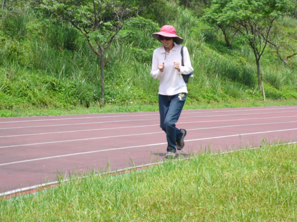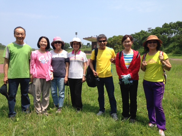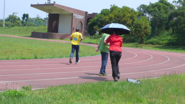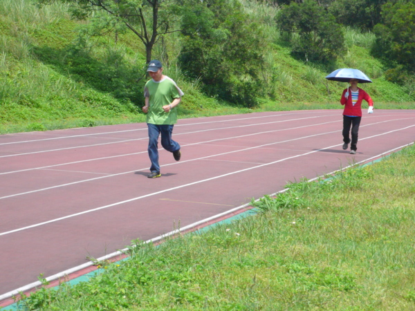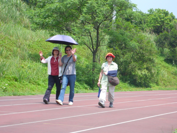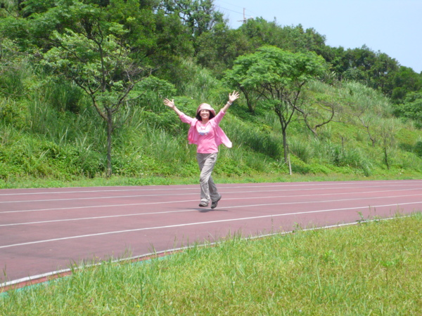 這裡有一處觀景平台,可以俯瞰整個馬偕池谷地。 二、運動場上:走出步道即見廣大平坦的運動場。 好棒的跑道! 鐵人! 跑! 眾人鼓譟之下,鐵人帶頭跑操場,立刻就有人跟進。 以走代跑一樣健身! 勇健跑步組。 再來一圈! 厲害! 我們也要試試看! 三、老梅綠石槽:綠石槽海岸位於北海岸石門區老梅里,為全台唯一特殊景觀。 車子才停妥,大夥急急奔向湛藍的海,很少人注意到路旁開滿了天人菊。