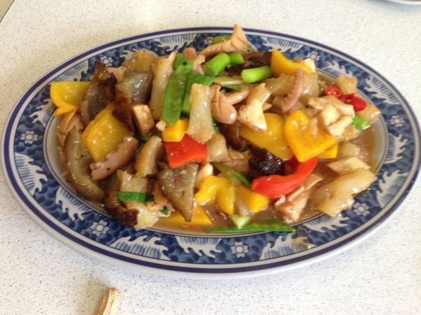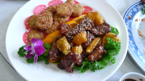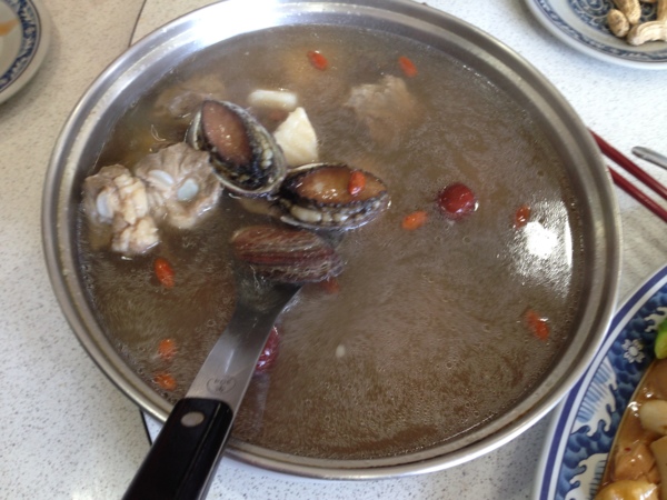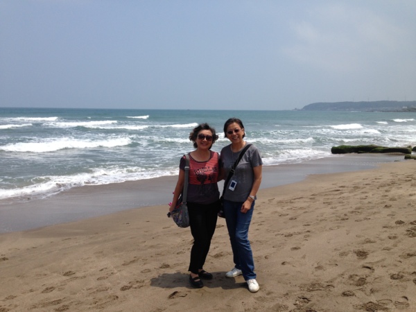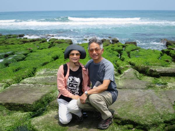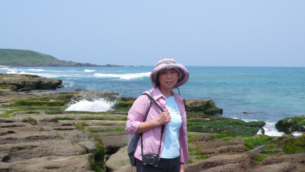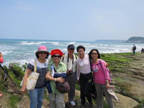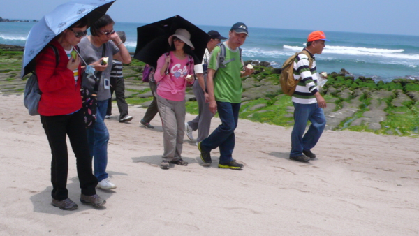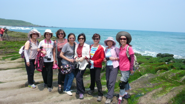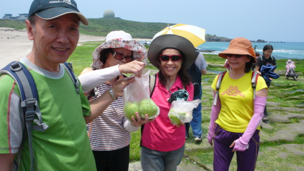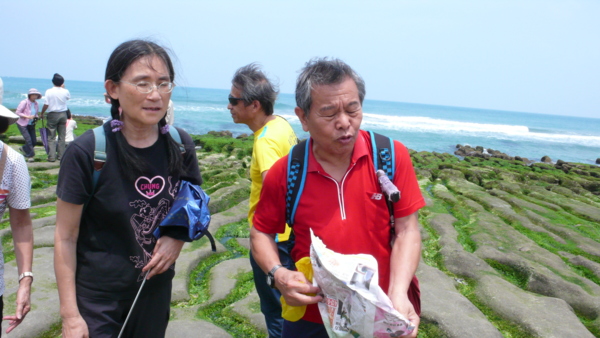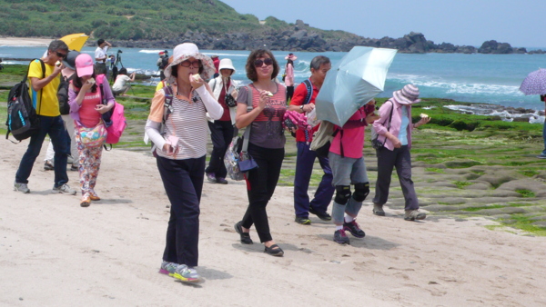 浪花太美了! 趕緊搶鏡頭! 綠石槽在遊客的踩踏下已面臨生存危機,所以北觀處提醒遊客留在沙灘上觀賞,不要踩到綠石槽的範圍,尤其綠石槽上方相當滑溜危險,極易滑倒受傷。 阿伯的芭樂! 讚! 阿伯一數,今天來的人多了,芭樂少一片,於是讓出自己的一片,太謝謝啦! 邊走邊吃更有滋味! 依依不捨地離開這美麗的沙灘。 四、英芳飯店午餐:哇!這可是咱笑嘻嘻的好朋友英秀和吳芳合開的店? 寶貴和秀秀提供好吃的毛豆和花生。