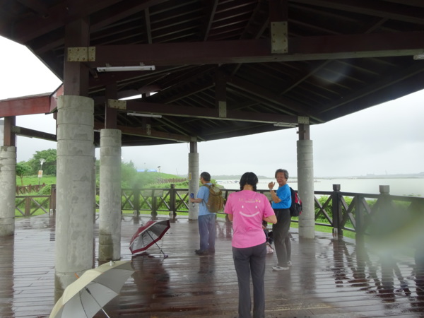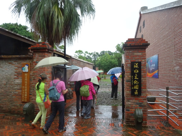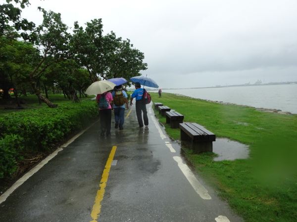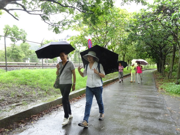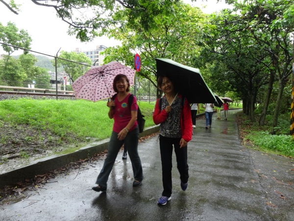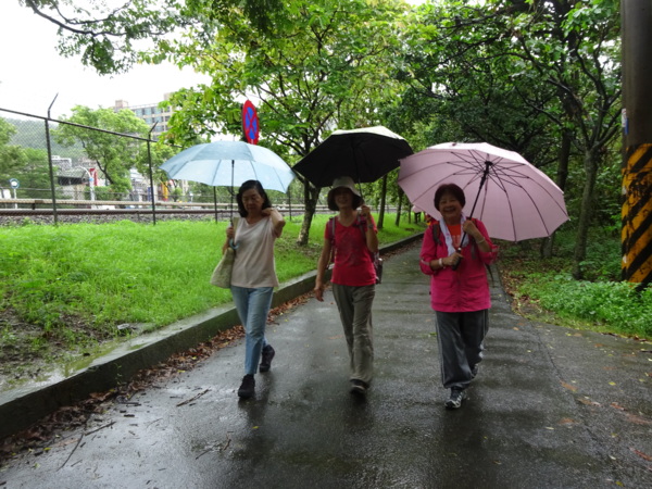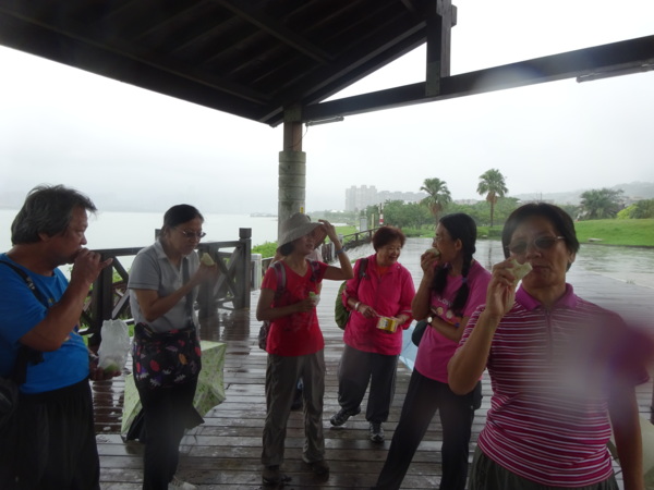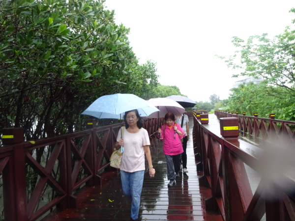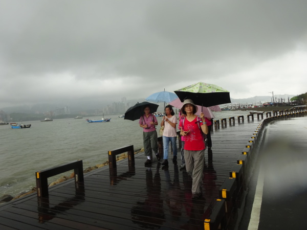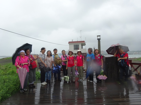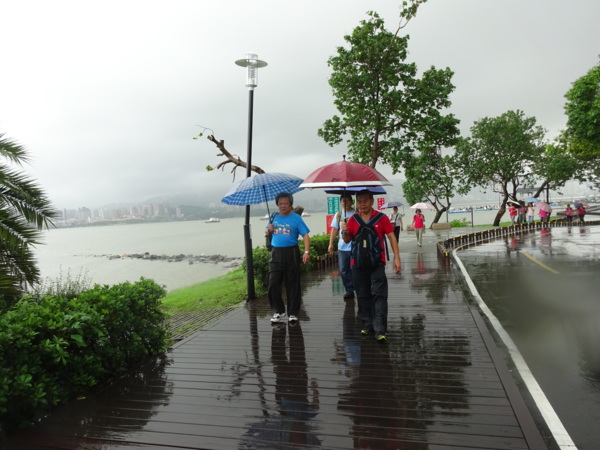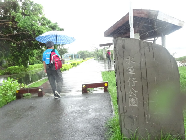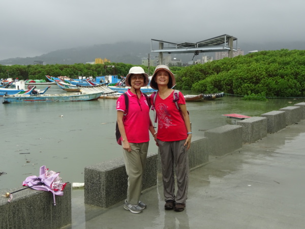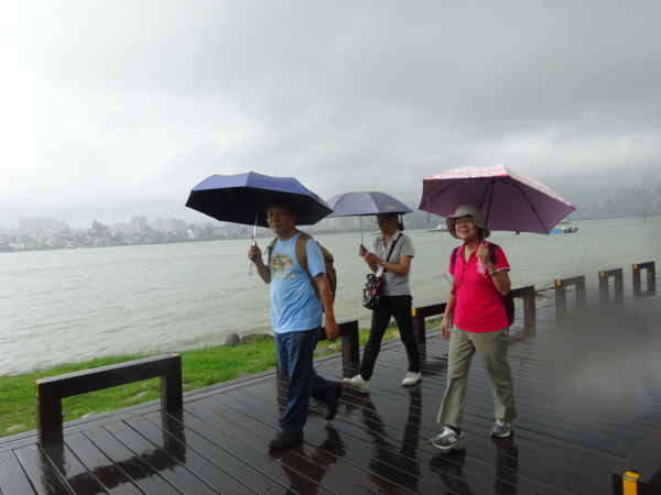 淡水河畔的一席盛宴-自然生態與歷史文化之旅 時間:2015.08.31 集合地點: 9:00紅樹林捷運站2號出口集合(洗手間在1號出口) 健行路線:紅樹林捷運站→紅樹林自然生態步道→淡水百齡公園→淡水文化園區→淡水捷運公園→淡水渡船頭→搭渡船到八里左岸(可使用悠遊卡) →老榕碉堡→八里左岸公園→水筆仔公園→挖子尾自然保留區→觀海長堤→文化公園→十三行博物館(免費參觀)→陽光廣場涼亭午餐(自備) →搭新北市公車洪13回關渡捷運站 夥伴:慶輝、仟幸、鎮揚、淑清、顏百、兆榮、椿汸、新綠、英秀、桂枝、偉文、林真、蔡薏、尤美雲、陳美雲 、 玟瑛、吳芳、淑娟等18人, 足跡:時而霪雨霏霏,時而大雨滂沱,我們仍遊興不減,走入紅樹林的步道! 紅樹林有聞名全世界,最大的「水筆仔」純林。佔地廣達76.4公頃,木棧步道與賞鳥高台等休閒設施逐步完整,是容易貼近又有趣的自然生態區。風雨漫天飄晃,雲層烏黑壓頂,岸邊漁舟散置,遠觀舟船,如見而未見,不見而似見,河面惝恍而飄渺,幾分悽惻! 淡水,濃妝淡抹,豔陽陰雨,皆相宜! 我們參觀淡水文化園區的骨牌倉庫,八里左岸的十三行博物館,細細品味煙雨中,淡水獨特的自然人文風情! 一席盛宴,一場心靈的饗宴! 風雨中,我們走了9.9公里,1萬5千多步(根據何鎮陽的計步器)。有夥伴6人,因感冒,或禦寒衣物不夠,先行告退,希望他們平安健康! 相伴走一程,或全程,都無所謂,因為我們相信,我們情感是恆久長存的! 相見歡~久別歸來的大漠四俠客,帶來絲綢之路遙遠的回音。 每個星期一,我們總笑嘻嘻,一起迎向風雨或晴天烈日。沿紅樹林木棧道走,展開自然生態之旅! 謝謝領導!每星期規劃行程,配合天候陰晴雨風,配合我們逐漸老衰身膝,還要兼具感性與知性,mission impossible! 思念總在分手後~旅行是美麗的,思念是綿長的。風塵僕僕,行走在異地壯闊的山水之間,我們四人仍常談著笑嘻嘻,笑嘻嘻是第二個家! 「跟地球做朋友,快樂過生活,樂活淡水紅樹林」,紅樹林生態活動的標語,簡潔又貼切! 紅樹林的得名主要來自植物含有大量的二次代謝物——單寧,單寧遇到空氣中的氧氣會氧化成紅色,尤其是在根、莖這些葉綠素含量低的地方,看起來像鐵鏽一樣的紅褐色,因此被稱為紅樹林。目前台灣紅樹林分佈區域及樹種如下: 水筆仔:台北淡水到高雄縣梓官鄉典寶溪口。 海茄冬:新竹縣新豐鄉紅毛河至屏東縣東港鄉大鵬灣。 欖李:台縣七股鄉曾文溪口至高雄市旗津區。 五梨跤:台市安平區四草鹽田至高雄縣梓官鄉典寶溪口。 隔音牆、木棧道,隔出一片世外桃源。你可以徜徉,可以靜觀,可以深思~人與大地! 紅樹林的四大天王-水筆仔、招潮蟹、彈塗魚、白鷺鷥。可惜風雨昏黑中,我們只見白鷺鷥孤獨的身影。 山水樹林,傍著風馳的捷運電車,有著追風、奔馳的生命美感! 棧道旁,連根拔起的老榕樹,令人怵目驚心,颱風的風雨威力,令人不寒而慄! 天若有情天亦老,天地無情! 淡水文化園區,原英商嘉士洋行倉庫(殼牌倉庫) 123或321,要收傘? 我們笑開懷! 喜悅來自內心的簡單、直純,風雨共走一段淡水河岸,就是最大的喜悅! 嘉士洋行倉庫(淡水殼牌倉庫)擁有四座大倉庫、三座小建築物、油槽遺址,約近4千坪的土地面積,見證淡水開港、日本領台、二次世界大戰美軍轟炸台灣等重要歷史時刻,是北台灣少數僅存的洋行倉庫,也是台灣少數僅有的工業遺址古蹟。 攜手風雨路~人生難得,姻緣難遇! 空蕩淒清的淡水捷運公園,烏雲沉重的呼吸著。 連日大雨,河水波濤洶湧,幾乎淹過人行步道。 就像希臘神話薛西弗斯,推著石頭,日復一日;我~也忠誠於我的工作,表演我的肢體,不管人群熙攘,或人煙緲至! 雨大把大把的落,寂寥、冷清的河邊,遺世而獨立的淡水! 乘船去八里左岸吧! 船隻載著我們的夢想與笑靨,來到八里左岸!