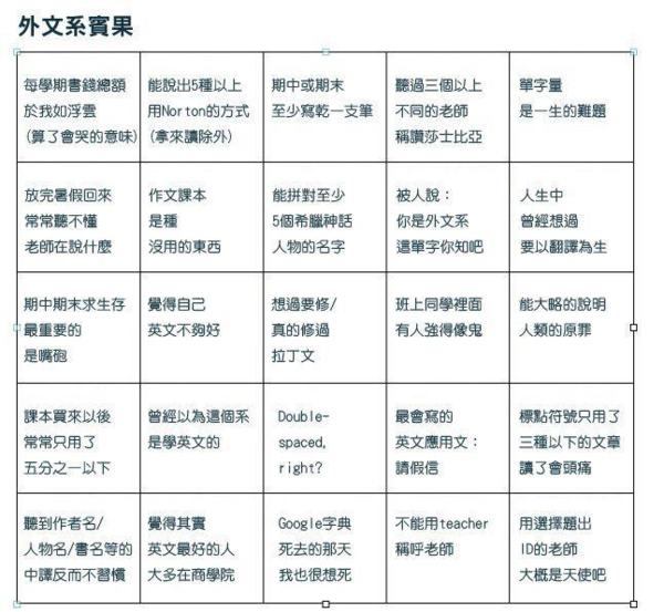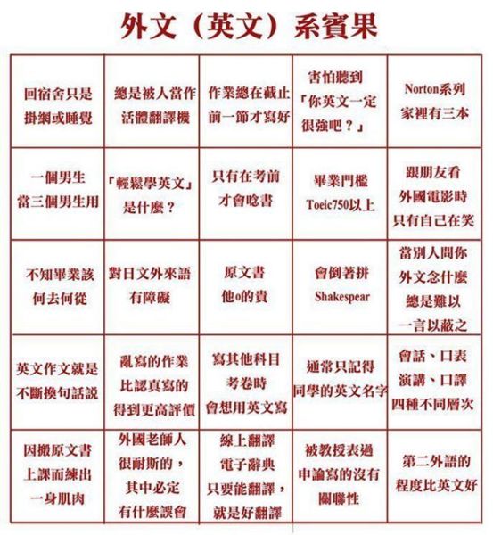 http://www.thinkingtaiwan.com/content/3138 https://wendyyc.wordpress.com/2014/09/14/dfllisawesome/ 2. 外文系要幹嘛賓果 (外文系是英文不好會活得很慘的系, 學藝不精也不好過! 要努力才能學會本領, 讓老闆想用!) http://www.dailyenglishquote.com/tag/%E5%A4%A2%E6%83%B3/ 1、不斷問自己問題。每個問題都會開啟自我探索的門,然後,值得你信仰的東西就會顯現在你的現實生活中。 2、相信自己。怎麼做到?通過每一次解決問題、接受挑戰,通過視覺想像告訴自己一定做得到,也相信他人。3、學會接受失敗,否則你永遠不會成長。 4、接受你是不完美的。生活不是一條一直上升的直線,而是一條上升的曲線。 5、允許自己有人的正常情感,包括積極和消極的情感。 6、記錄生活可以幫到你。 7、積極思考遇到的一切問題,學會感激。感激能帶給人類最單純的快樂。 8、簡化生活。貴精不貴多。對自己不想要的東西學會說“no”。 9、幸福的第一要素是:親密關係。這是人的天性需求,所以,要為幸福長久的親密關係付出努力。 10、充分休息和運動。 11、做事有三個層次:工作、事業、使命。找到你在這個世界的使命。 12、記住:只有自己幸福,才能讓別人幸福。教育子女最好的方法就是做個誠實的父母。