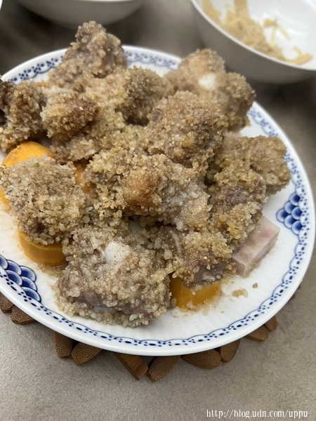 粉蒸肉,有地瓜跟芋頭,但還是跟地瓜比較搭。
