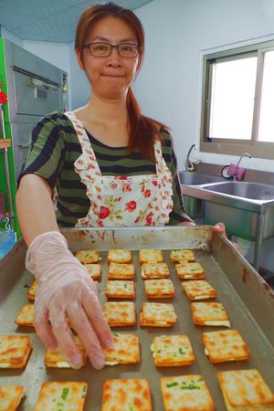 異國零食引發創意 嚴選天然食材 熟悉中藥燉補的林琪美很懂得養身,成為人母後更關注家人的飲食健康。起初品牌商品僅有法式起士蛋糕,同時也嘗試製作法式餅乾等產品,但日本著名的法式起士夾心餅乾外甜內鹹的口感,讓她突發奇想!「何不來做外鹹內甜的法式夾心餅」,於是她採用加拿大頂級麵粉,調配高品質牛奶,灑上宜蘭三星蔥與無苦味的岩鹽,製做出酥脆鹹香的香蔥酥打餅。而內餡夾心,則不用日本人慣用的花生醬,而是用天然海藻糖做出軟硬適中的特製牛軋糖。