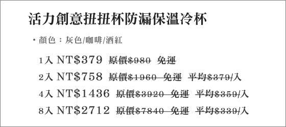 平均每入最低只要339元起(含運)即可購得活力創意扭扭杯防漏保溫冷杯(附吸管)1入/2入/4入/8入,顏色:灰色/咖啡/酒紅。