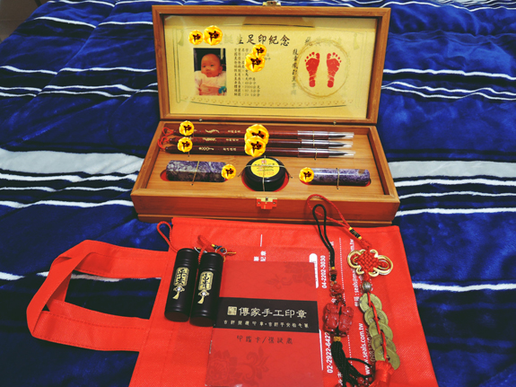 看看我的嬰兒三寶成品!!是不是跟我一樣驚艷啊!! 東西多到我的床都快擺不下了!!真是一份大禮物,包羅萬象的,有胎毛筆、臍帶章、印泥、印鑑卡、印章圓筒、一對紅貔貅、吉祥如意五帝錢、精緻的小三寶竹盒,琳瑯滿目,讓我一一介紹給大家吧!