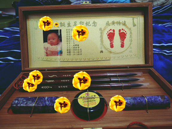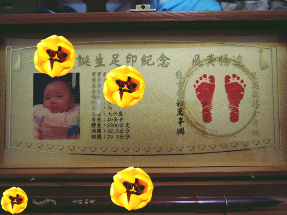 傳家大三寶的盒子上頭會有可愛的寶寶照片跟一些個人基本資料,重點還會有可愛的小腳印喔!!!非常可愛,我最喜歡看我家小饅頭的小腳丫,常常在娃娃床上就很活潑的踢來踢去超有活力的,小小的腳丫印當作紀念,祝福小饅頭未來的每一步都可以走得很順遂,一步一腳印踏踏實實的經歷這美妙的人生路程,這是媽媽我的小小期望,也有我深深的祝福。
