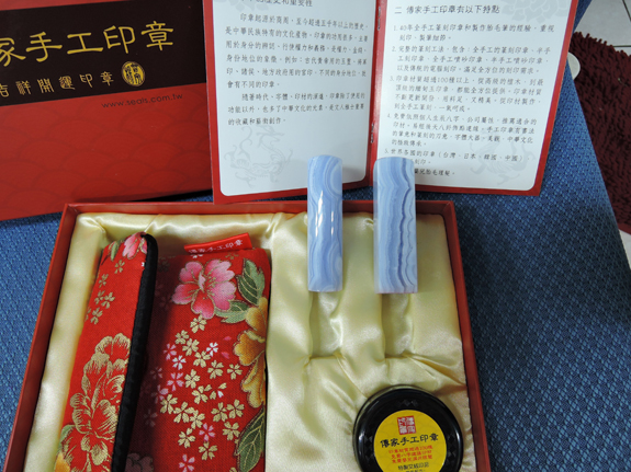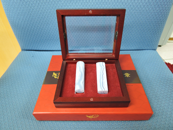 那天到現場去看的時候,真的只能用琳琅滿目來形容,聽過的,沒聽過的材質名字通通有,我是門外漢,頂多知道有玉的材質,或是木頭材質,原來分得可細了,光是玉的就有好幾種,至於木頭材質,從以前到現在好像都是刻木頭的,所以這次要挑個不一樣的,最後選了這一款,藍紋玉。一個方章一個圓章,知道為什麼嗎?其實啊方章跟圓章的用途不一樣哦,圓章可以用在開戶,錢滾錢,因為是圓的,方章呢,就可以用在一些不動產上面,象徵穩固。