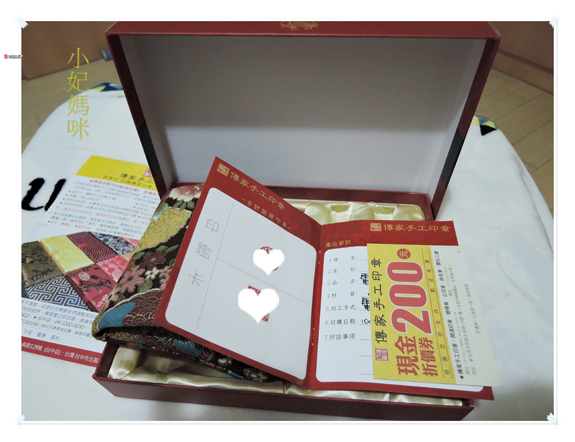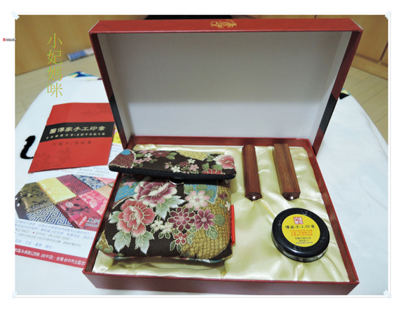 印章這種東西平時不用的時候,放著不知不覺就可以擱上好幾年,等到需要使用的時候,怎麼找也找不著,我的舊印章被我弄丟了,當了媽媽了之後,記性真的有差,加上最近準備要搬新家,忙進忙出的,怎樣都想不起來在哪裡,所以我到朋友介紹的傳家手工印章去刻了一組新的印章了,開心!先來看看照片囉! 登登登~~~請看~~這是我的新印章禮盒開箱文;打開盒子之後的模樣,除了一對印章之外還有附贈的手工布包跟艾草作的印泥。