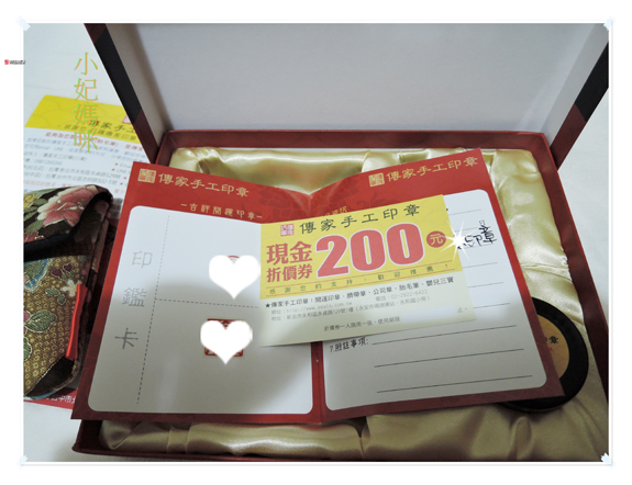 除此之外貼心的店家還送200元現金折價券,我打算送給介紹我去傳家的朋友,聽說她年底還要再去做臍帶章,現在我也可以了解為什麼她這麼喜歡這間店,謝謝她介紹這間店給我,我還是第一次看到一間店有這麼多材質可以選擇,超過上百種真的不誇張,這讓我非常驚艷,還有很多我沒看過的種類,真的是很用心經營的一家店,不只印章種類品質好,店家的服務態度也讓我很滿意,所以藉這個機會介紹給大家好康道相報,有機會一定要去看看喔。 |