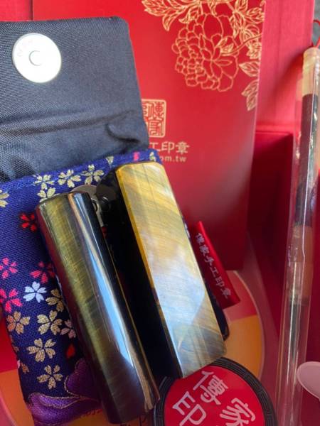 順便介紹一下這個藍色刺繡布包是傳家手工的印章隨身包,而且是禮盒的附贈品喔!超讚的買印章竟然送這麼好又實用的東西,雖然是贈品但是做的非常細緻,保護印章的程度也非常夠,看看這厚厚的布包就知道了吧!太開心了