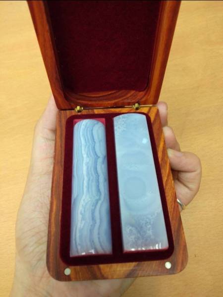 我內心真的好像有一百隻小鹿亂撞~ 因為我以為水晶印章已經很漂亮了,沒想到藍紋玉他層層的藍色、白色交錯的美感 更是打動我的心,不誇張,真的像雲朵一樣可愛,裡面有一粒粒天然的紋路,真的超讚 除此之外店員耐心的解說其他關於、字體、刻工、包裝、的細節給我聽也是非常~詳細