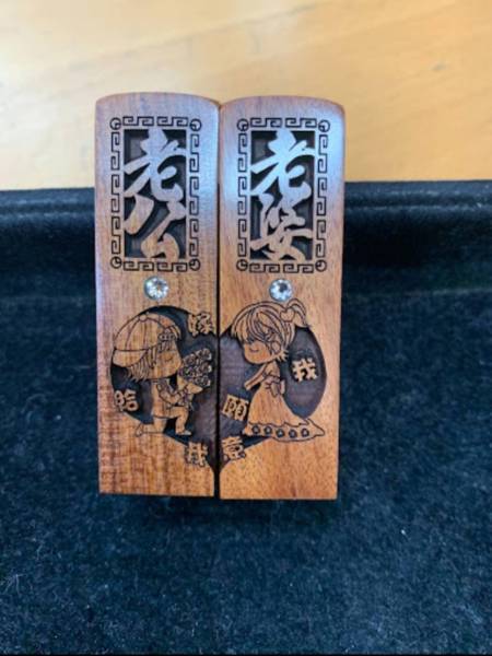 今天來新北永和傳家門市幫朋友挑選結婚對章~~~ 一進門小姐就很熱情的招呼我,經過說明我是要送人的所以有預算的考量 小姐跟我介紹了一組可愛又有意義的紅紫檀木的印章,印章上頭雕了可愛的老公老婆還有我願意的圖案