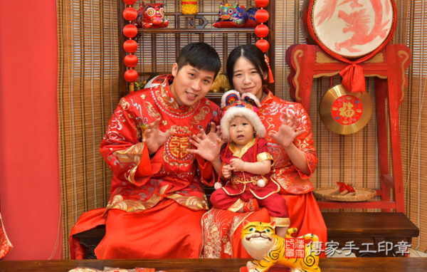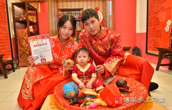 高雄徐家來抓周~全家身穿大紅色中式古禮服,圓滿喜氣~ 恭喜徐寶寶抓到彩色筆以後當藝術家,抓到相機以後當攝影師,抓到毛筆以後當老師