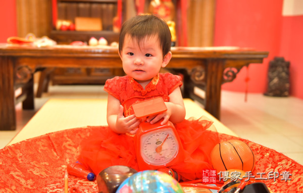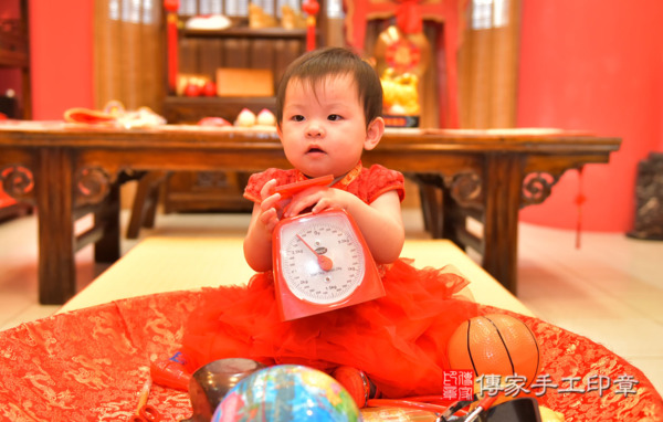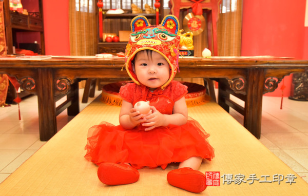 今天是高雄陳寶寶來抓周的日子~~身穿中式小孩古禮服蓬蓬裙還頭戴虎帽看起來可愛喜氣!