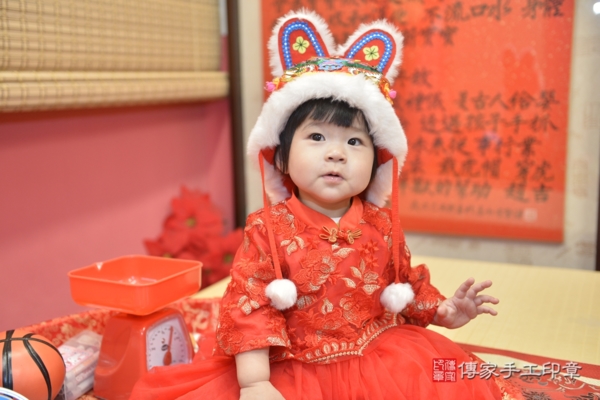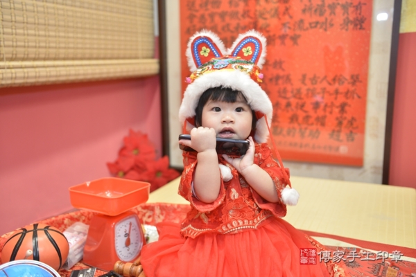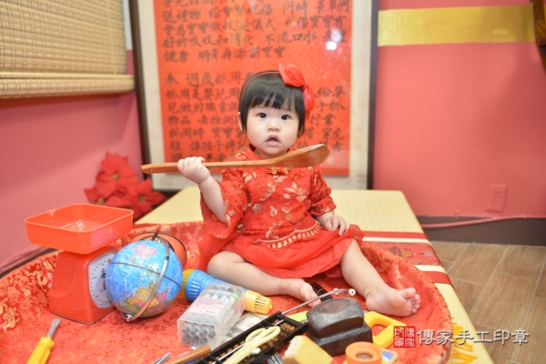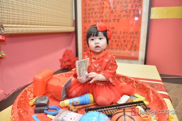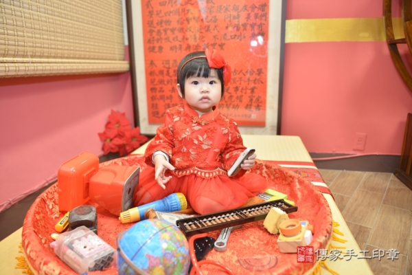 新北朱寶寶來抓周~~身穿中式小孩古禮服蓬蓬裙加上頭上的紅色大蝴蝶結看起來喜氣可愛~來看看朱寶寶抓到些什麼道具吧~