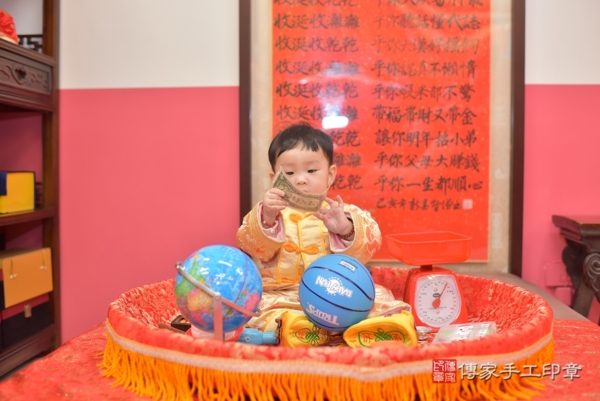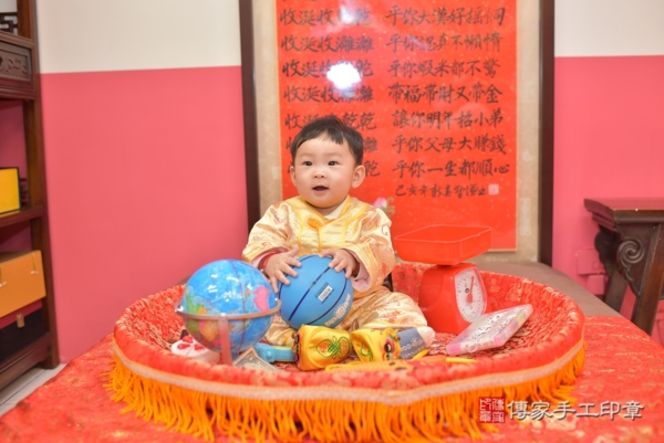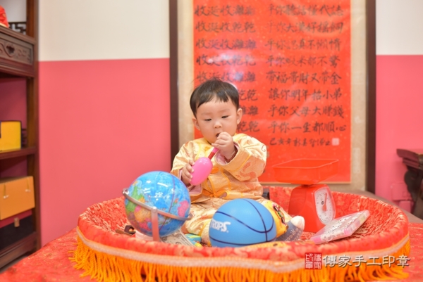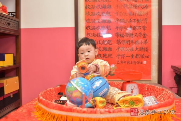 台中郭寶寶來抓周~~金黃色古禮服配上飛龍騰雲刺繡象徵招財進寶有福氣今天的抓週好精采,我們一起來看看郭寶寶抓到些什麼道具吧~