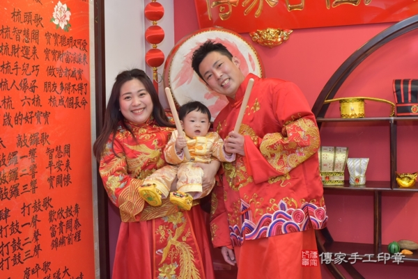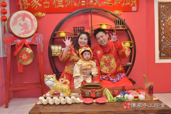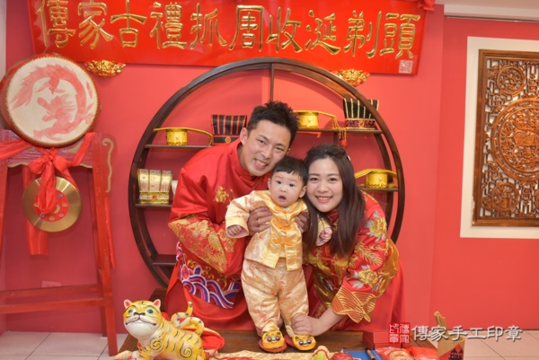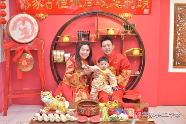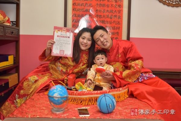 台中郭家來抓周~全家身穿紅色系中式古禮服,爸爸媽媽身穿一龍一鳳,象徵圓滿和諧與喜氣,另外郭寶寶身穿金黃色小孩古裝禮服,象徵吉祥招財進寶 來看看台中郭家的抓週儀式合照花絮吧~~恭喜郭寶寶抓到籃球以後擔任運動員為國爭光;抓到手機以後從事科技產業;抓到地球儀以後擔任導遊探險家環遊世界!