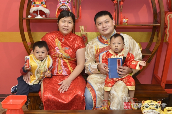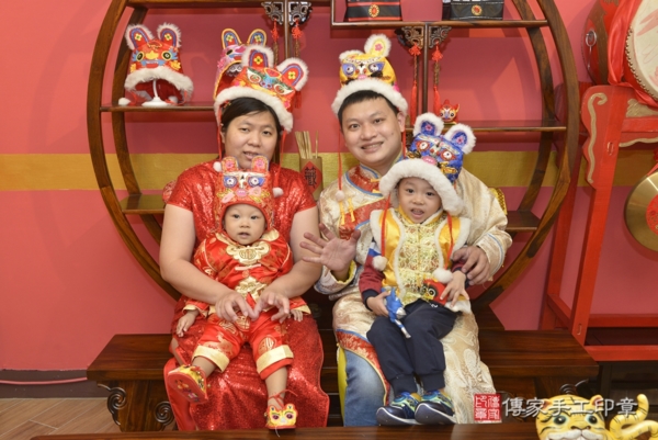 新北王家來抓周~全家選擇中式古禮服,爸爸身穿淡黃色長袍,上面的飛龍圖紋象徵好運平安;媽媽則身穿紅色亮片鳳凰圖樣旗袍,吉祥又喜氣!接下來是活動合照一起來看看吧~~