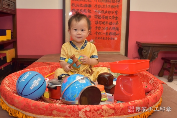 今天是台中黃寶寶來抓周的日子,身穿中式黃色古裝禮服象徵吉祥福氣;衣服領口、袖口及褲管的藍色點綴和諧又沉穩,一起來看看黃寶寶的抓週照片吧~