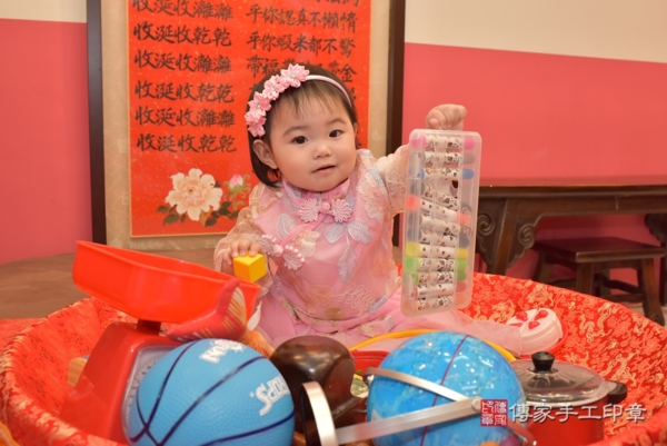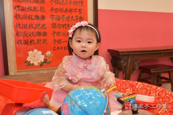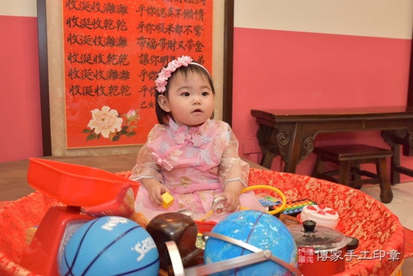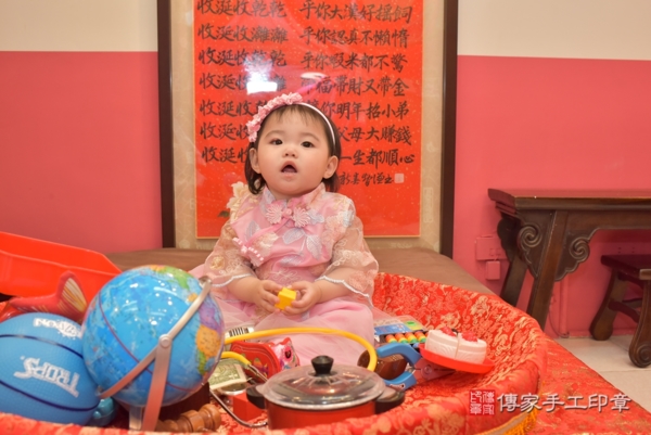 今天是台中鄭寶寶來抓周的日子,身穿中式粉色花花紡紗古裝禮服,再搭配粉紅緞帶小花髮箍可愛又喜氣,一起來看看鄭寶寶的抓週照片吧~