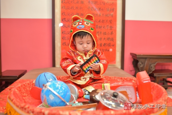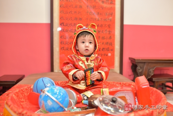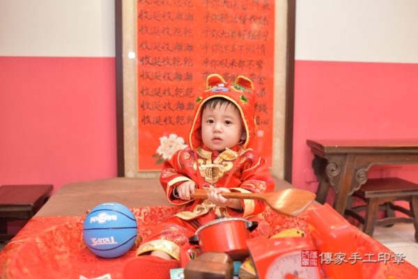 今天是台中楊寶寶來抓周的日子,身穿中式紅底圓體福字圖樣刺繡古裝禮服象徵喜氣、吉祥及圓滿!一起來看看楊寶寶的抓周花絮照吧~