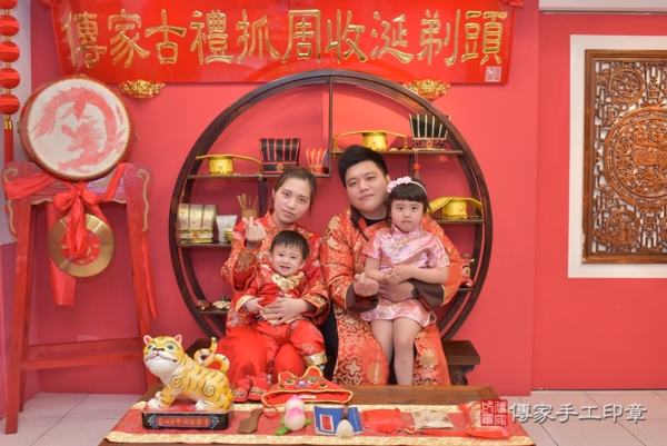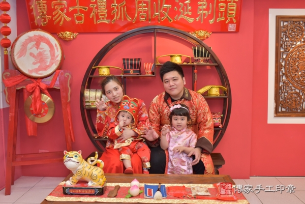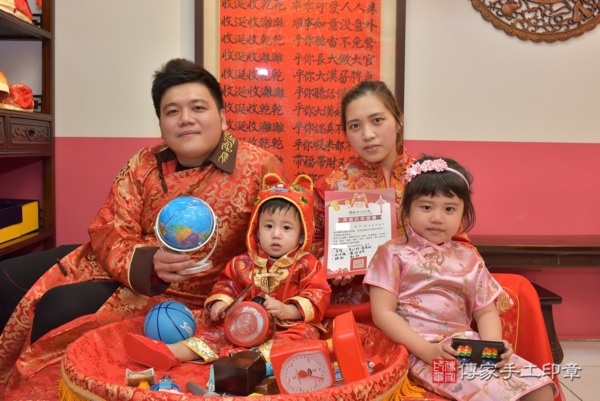 台中楊家來抓周~全家選擇中式古禮服,爸爸身穿紅色中式傳統雕花圖樣長袍;媽媽則身穿紅色百花齊放刺繡長袍,人比花嬌!紅色象徵喜氣、圓滿;姊姊身穿粉色小孩中式旗袍,頭戴粉紅緞帶小花髮箍漂亮又可愛,接下來是活動合照一起來看看吧~~
