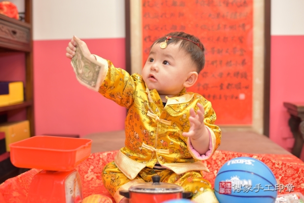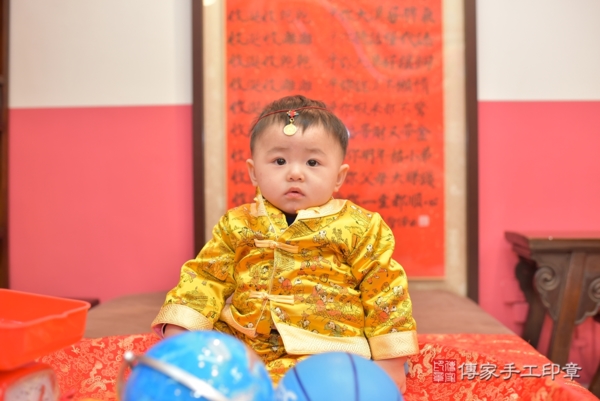 今天是台中陳寶寶來抓周的日子,身穿中式金色中式嬰兒古裝禮服,特別的是衣服上的中國風兒童市井生活圖樣,富有童趣及活潑感;而金色也代表福氣、財富、好運。一起來看看陳寶寶的抓週照片吧~