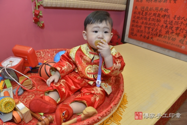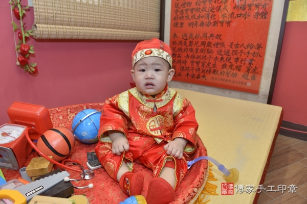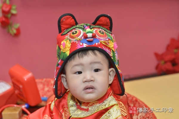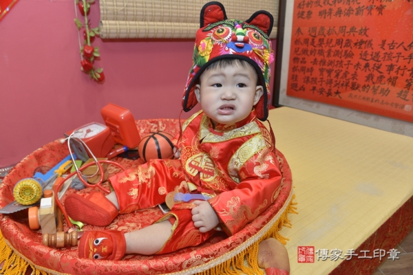 今天是新北林寶寶來抓周的日子,身穿中式紅色中式嬰兒古裝禮服,衣服上的飛龍及福字刺繡象徵福氣、好運。戴上同樣是紅色的虎帽,可愛滿分!一起來看看林寶寶的抓週活動照片吧~