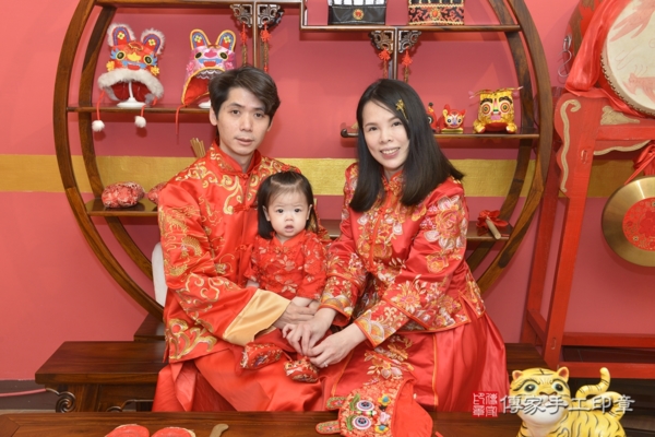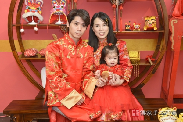 新北王家來抓周~全家選擇中式古禮服,王家一家挑選了中式風格古裝禮服,紅色象徵喜氣,爸爸身上的金龍圖案象徵吉祥好運、和諧順遂;媽媽身上的百花圖案,除了襯托氣質美麗之外,牡丹也是富貴的象徵;而王寶寶身上的金枝玉葉圖案襯托出小公主的感覺,也象徵王寶寶是爸媽心中最珍貴的寶貝喔!接下來是活動合照一起來看看吧~~