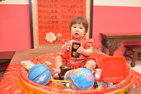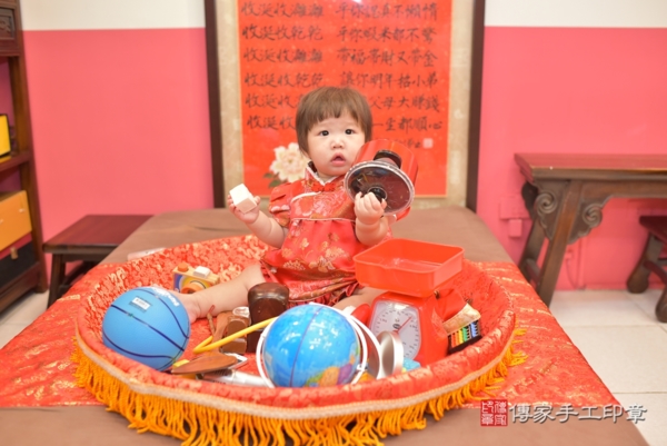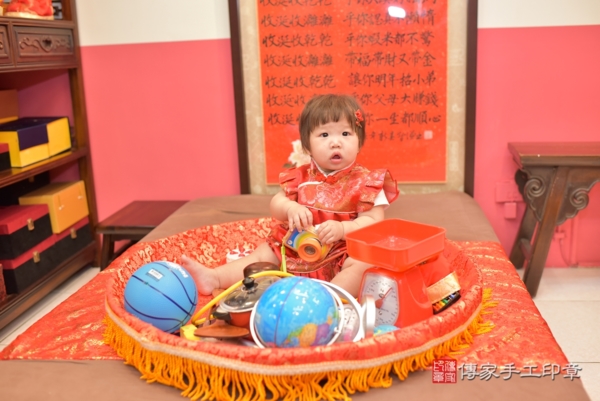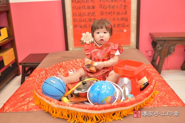 今天是台中李寶寶來抓周的日子,身穿中式嬰兒古裝禮服,紅色是代表喜氣,衣服上的牡丹圖案象徵富貴、高雅,頭上的紅花髮夾氣質又可愛,一起來看看李寶寶抓到些甚麼吧~