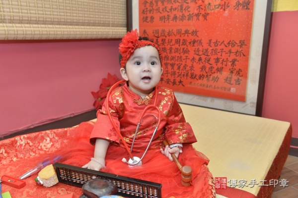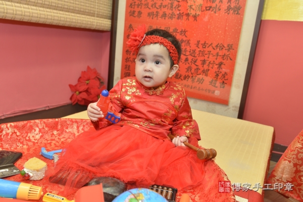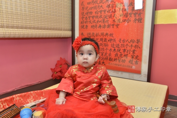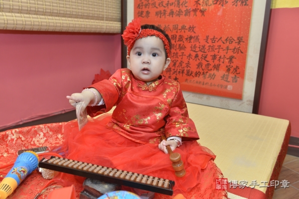 今天是新北廖寶寶來抓周的日子,身穿中式嬰兒古裝禮服,頭帶大紅花髮帶,紅色是喜氣的象徵,衣服上的金枝玉葉圖案象徵富貴、高雅。一起來看看廖寶寶抓到些甚麼吧~